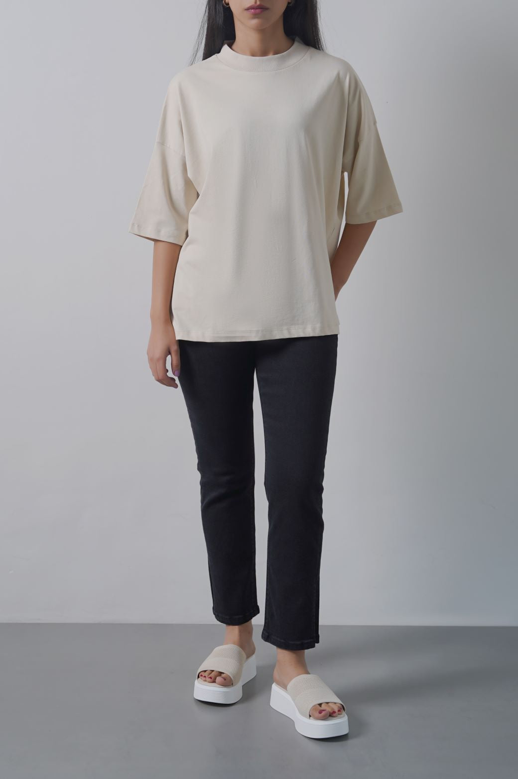 Design details: High crew neck with drop shoulder, short sleeves and side slits.