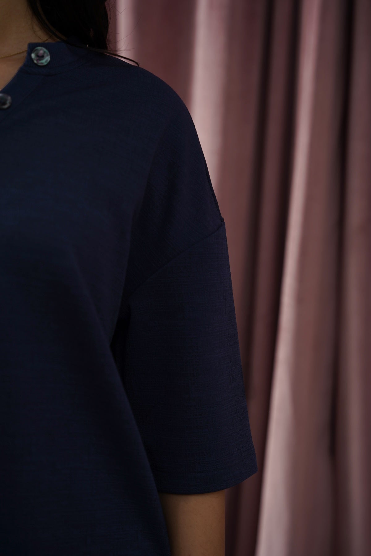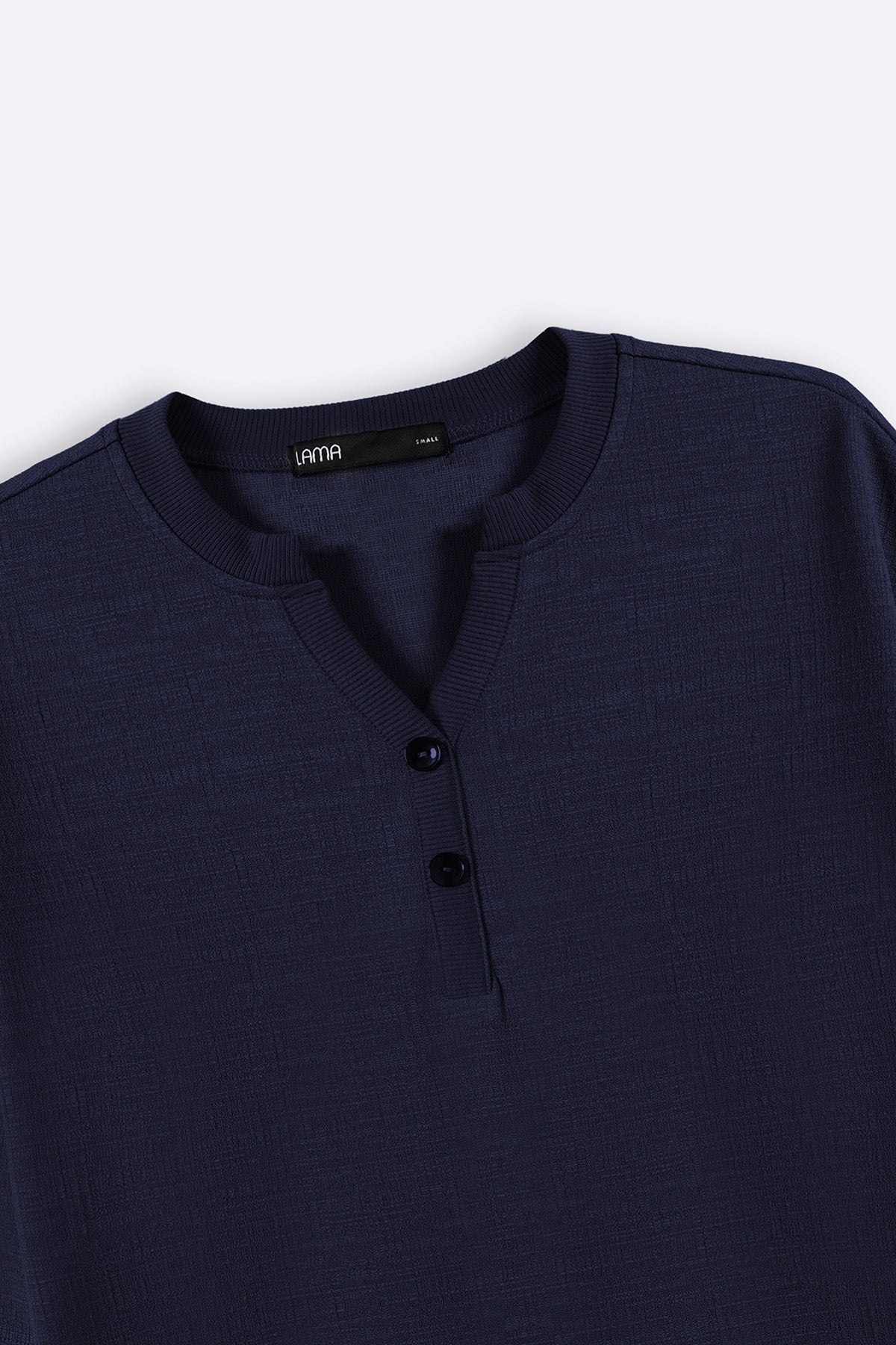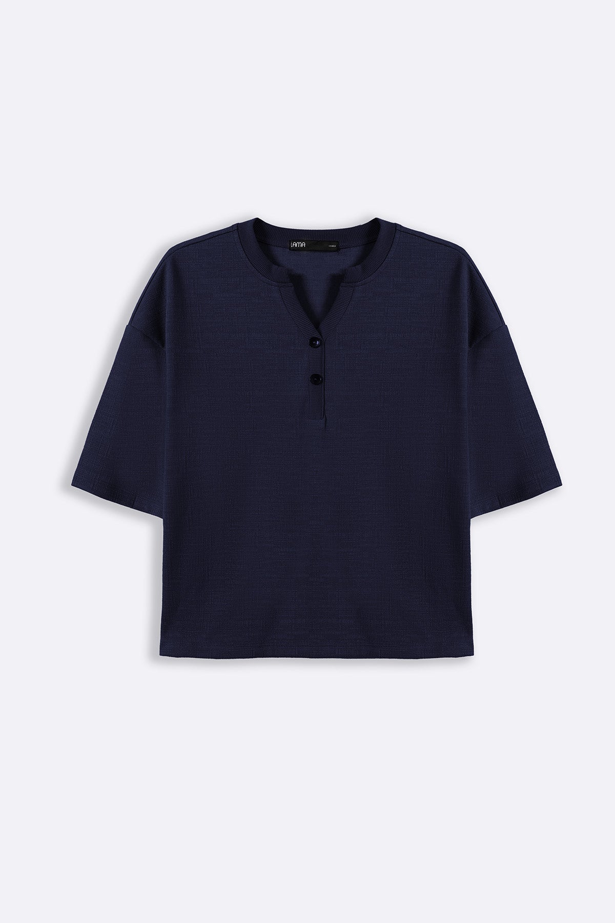 Design details: A short-sleeve Henley featuring a textured fabric and non-functional buttons at the front for a stylish, laid-back look.