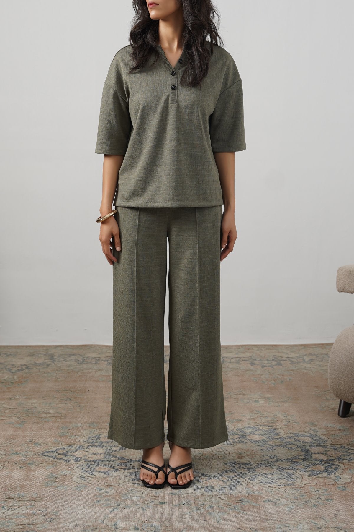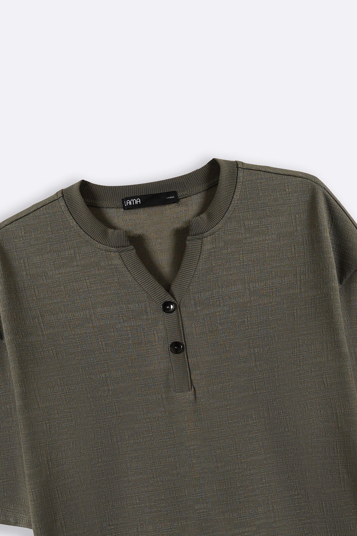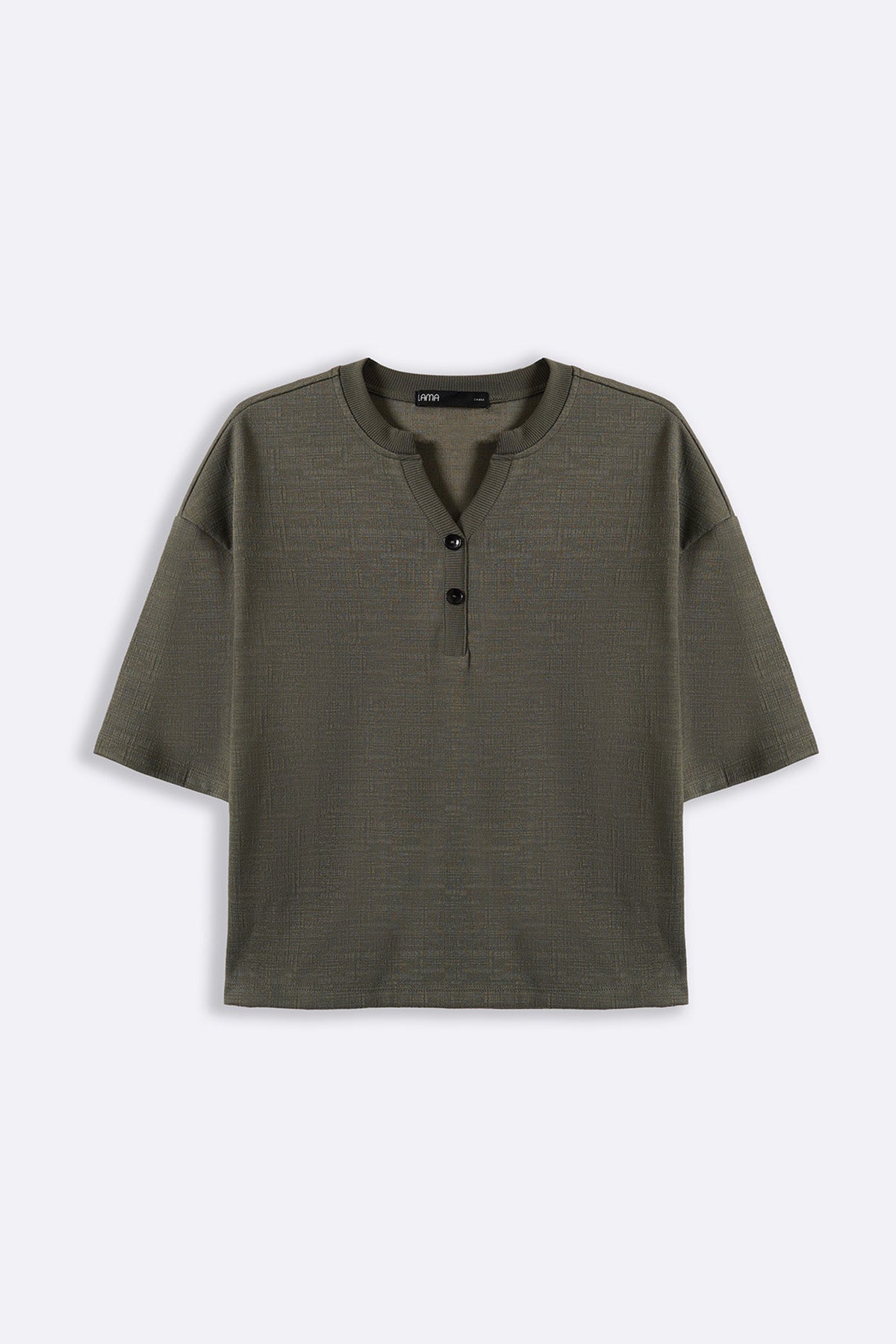 Design details: A short-sleeve Henley featuring a textured fabric and non-functional buttons at the front for a stylish, laid-back look.