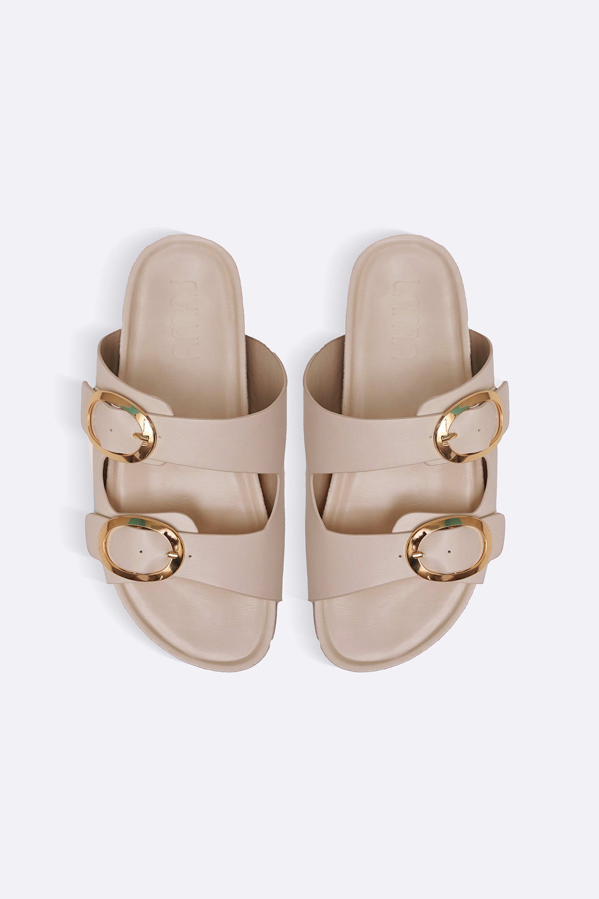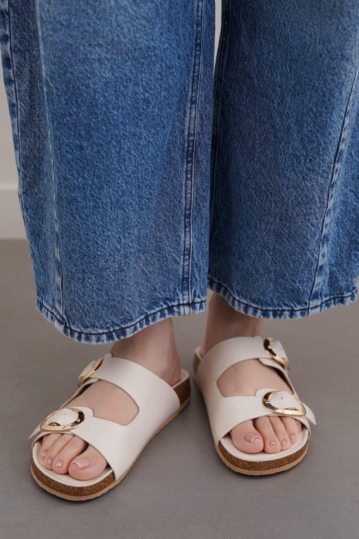 All day adjustable double-strap cork slides with good quality gold buckles and cushioned insole.