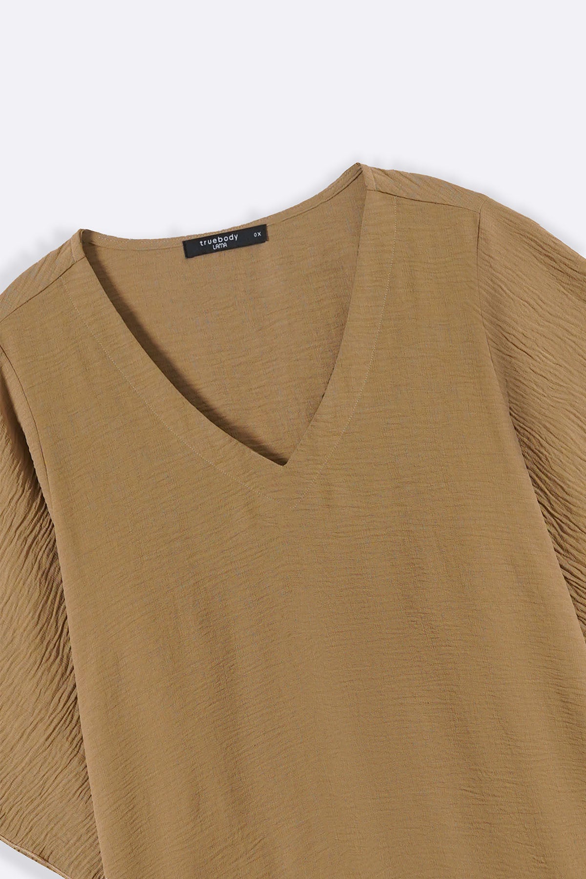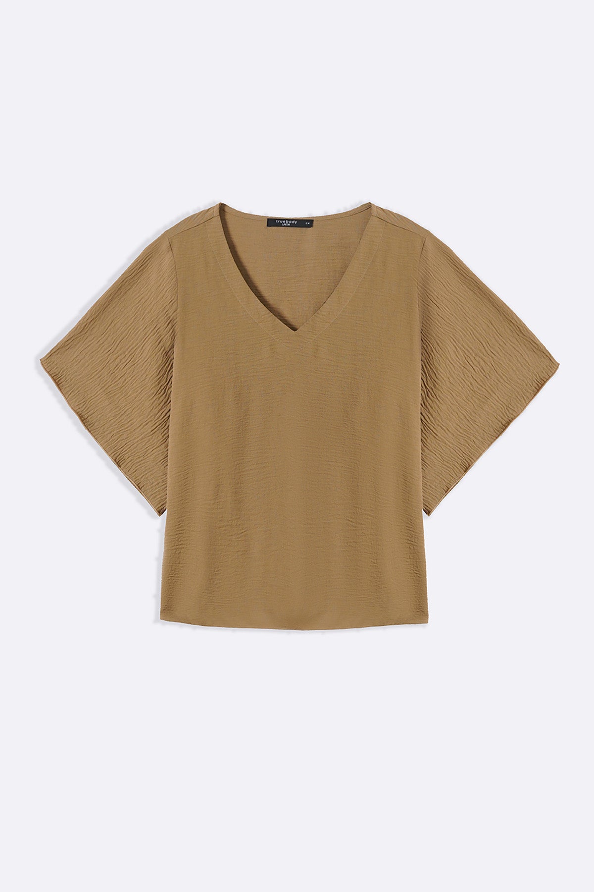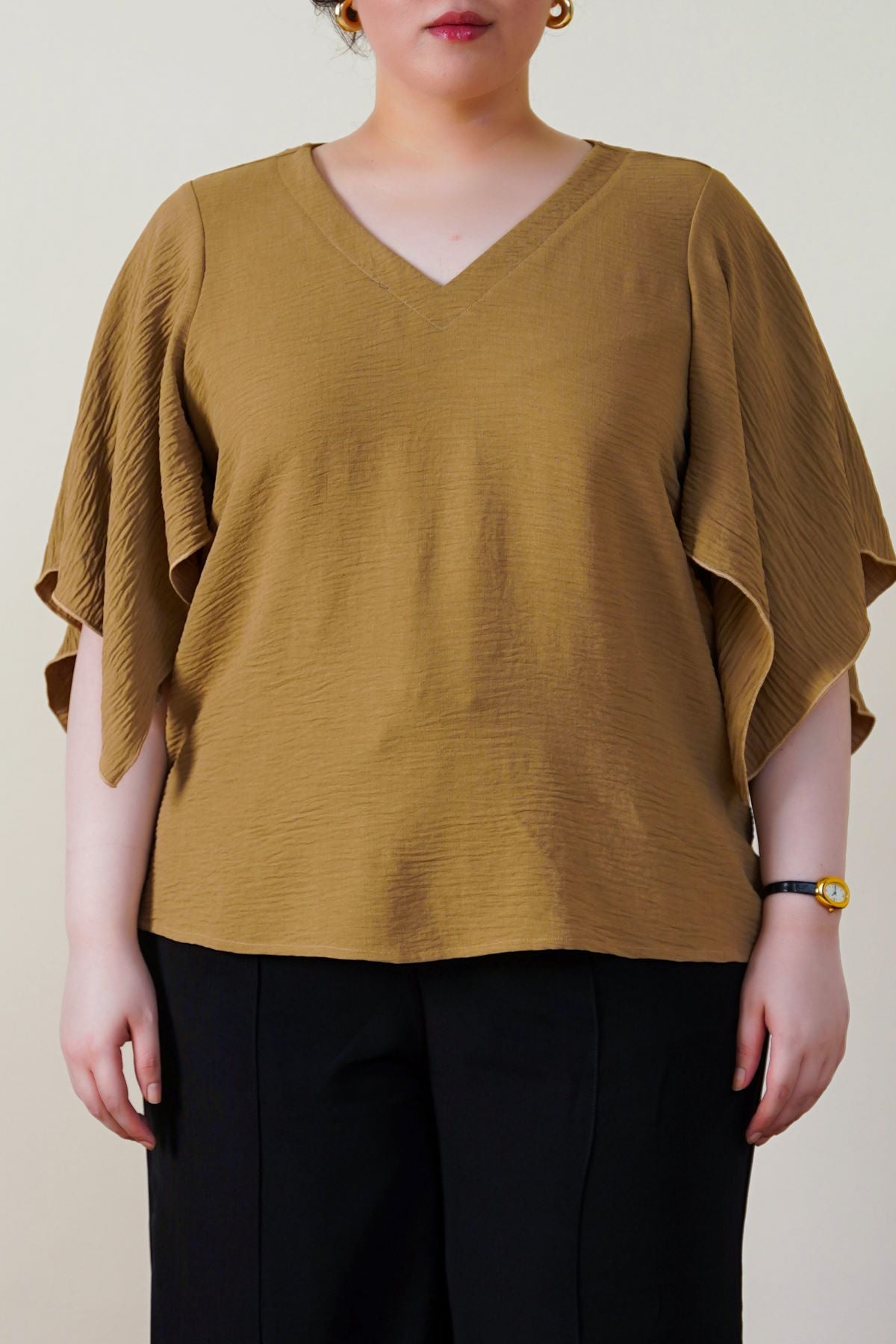 Design details: V-neck shirt with handkerchief sleeves and side slits.