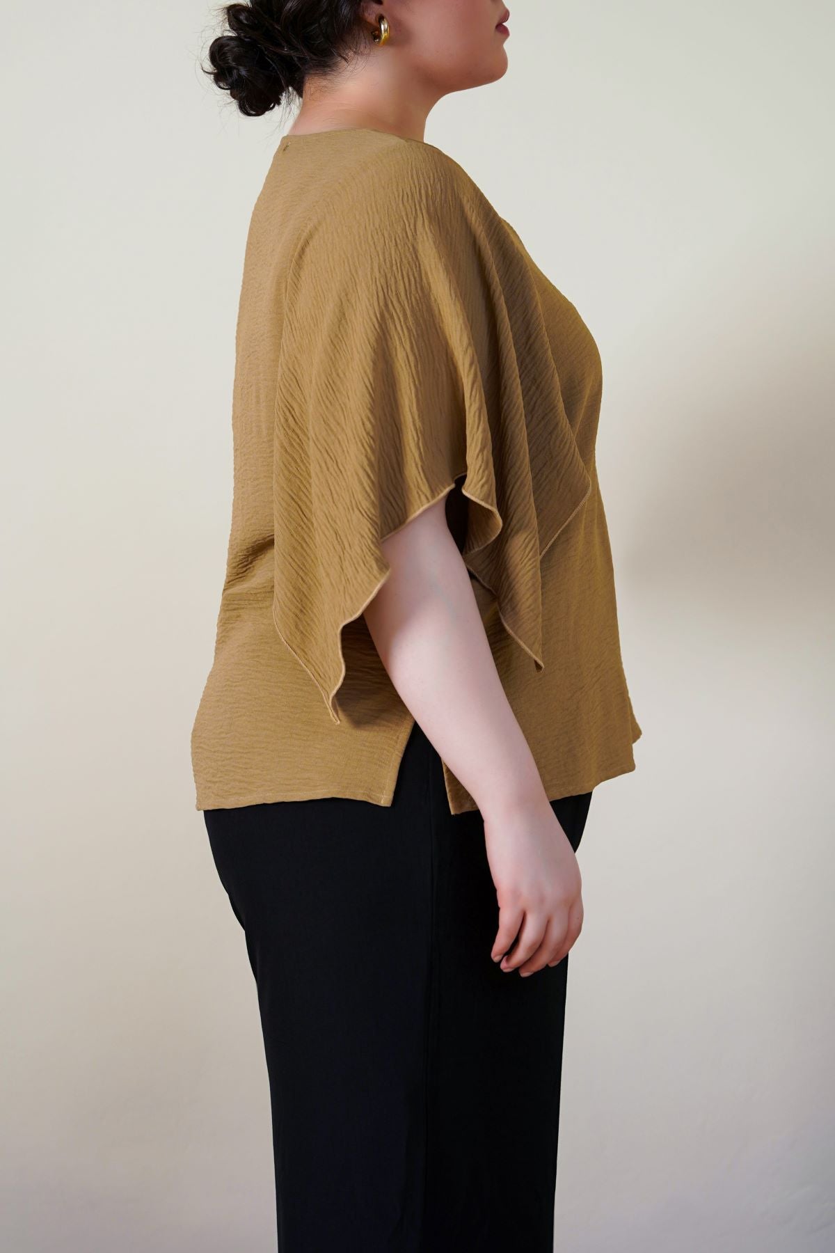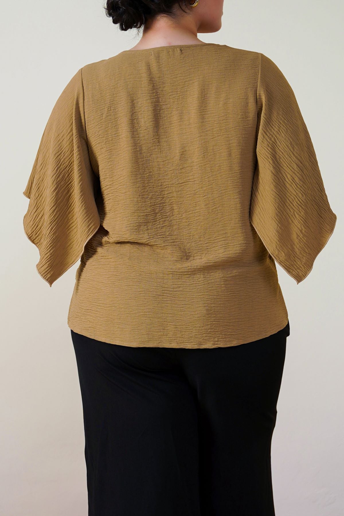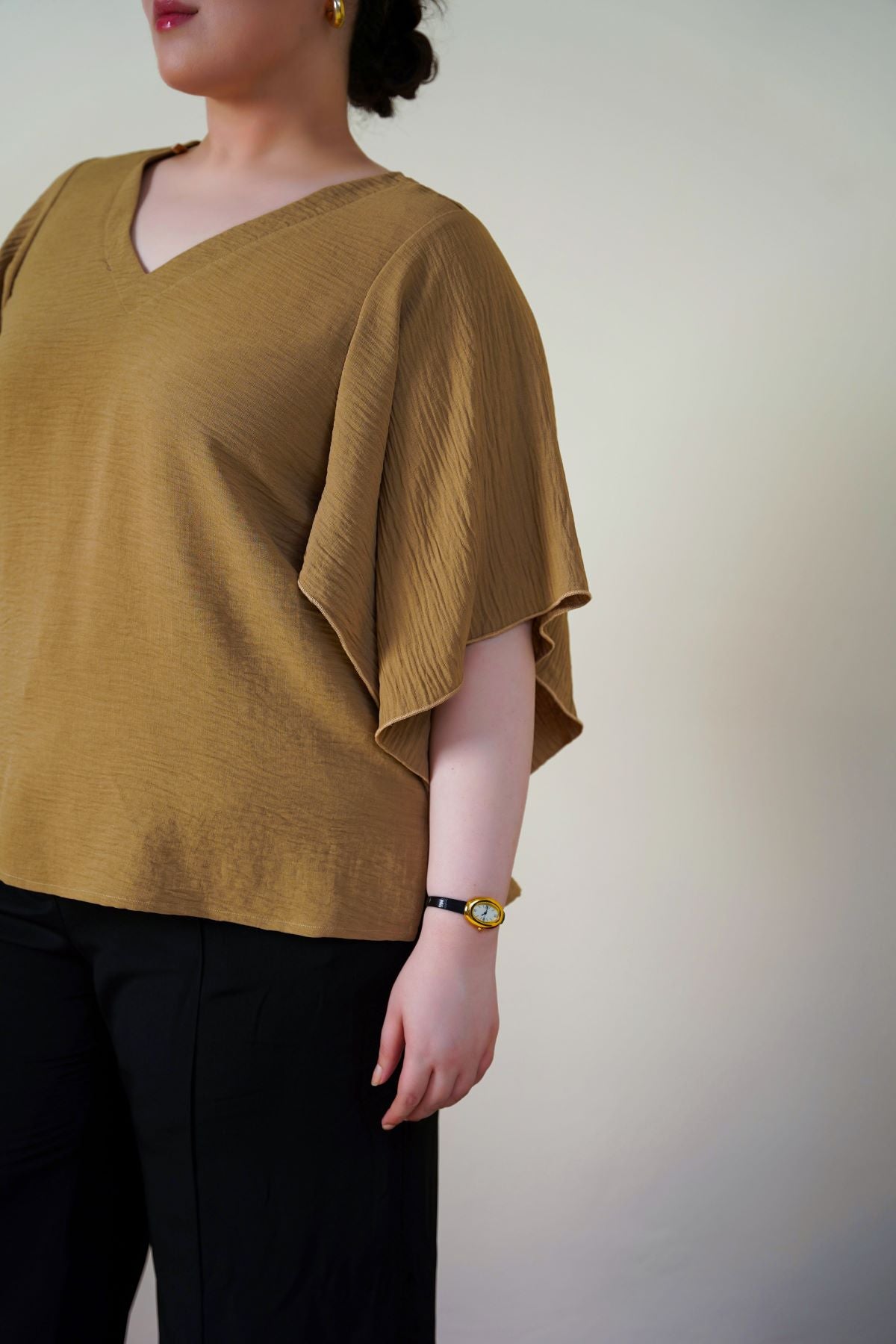 Design details: V-neck shirt with handkerchief sleeves and side slits.
