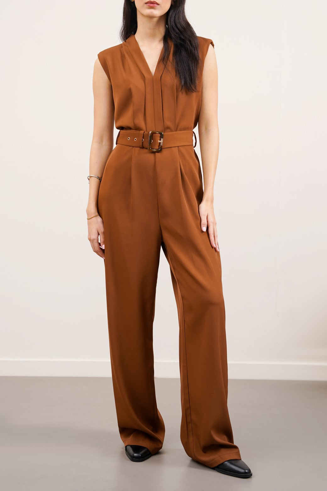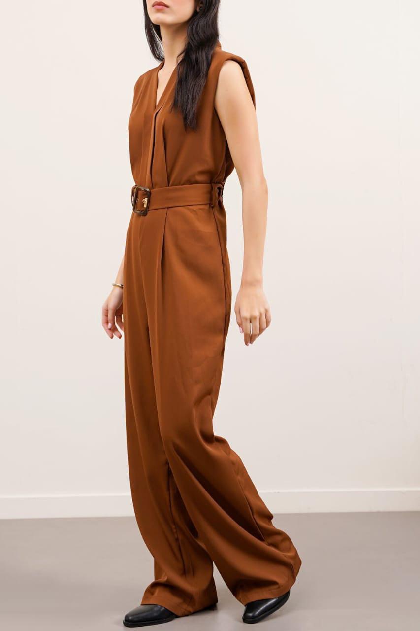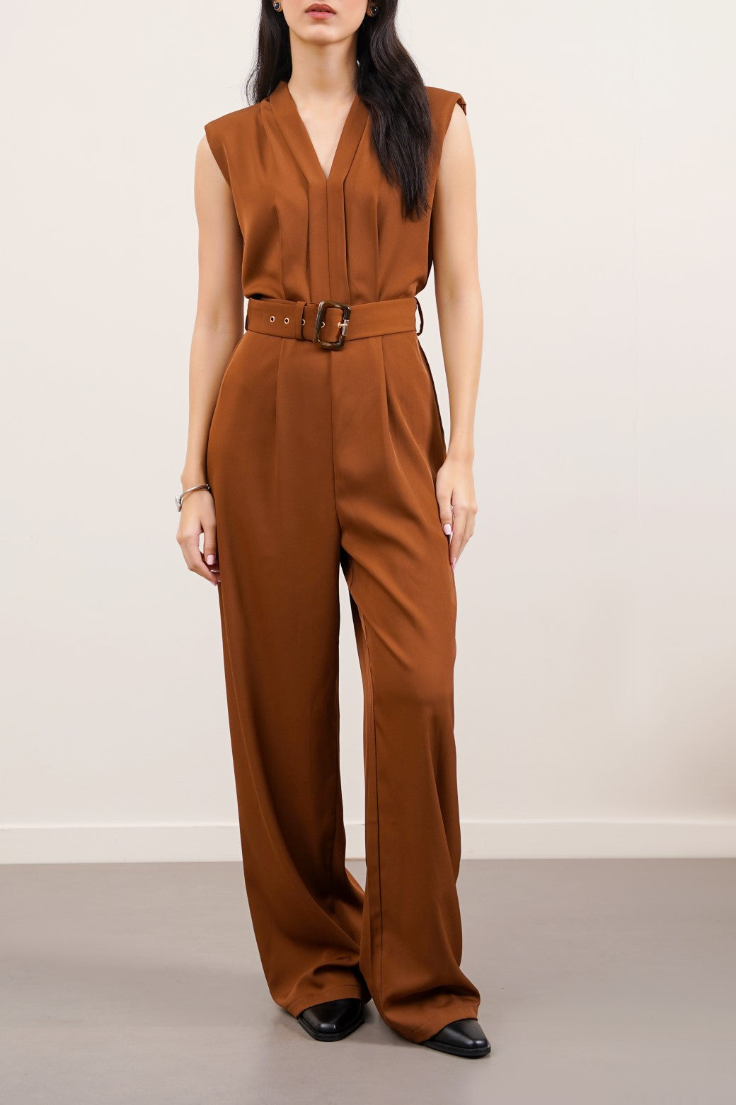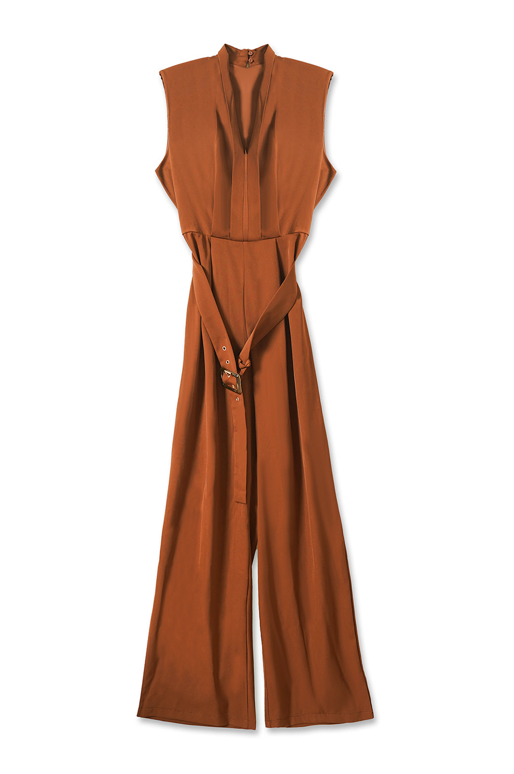 Design details: Sleeveless jumpsuit designed with padded power shoulders, a V-neckline, front pleats, and a wide-leg opening. It features a back invisible zip closure, neck elastic loop buttons, and comes with matching belt that has a metal buckle for cinched waist.