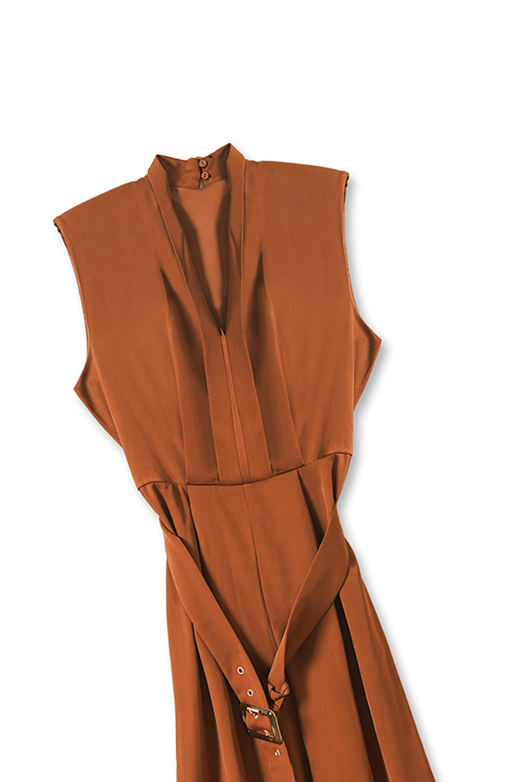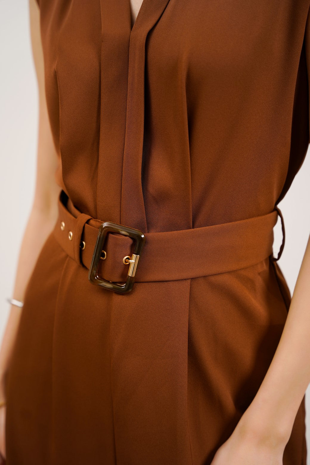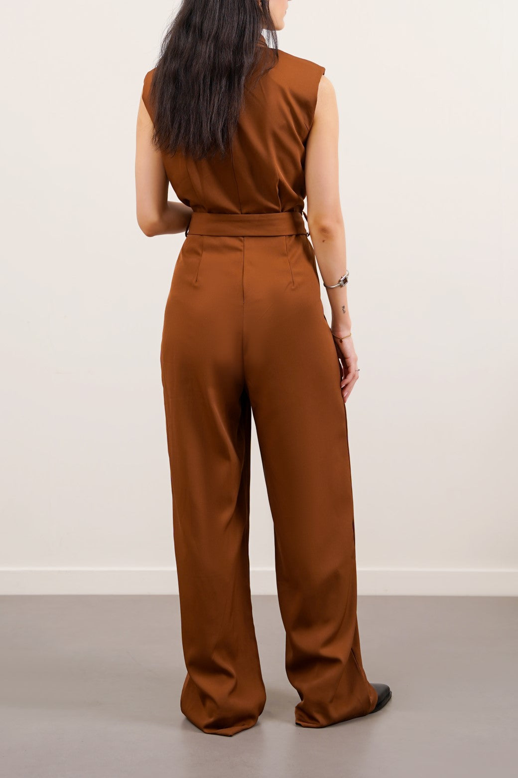 Design details: Sleeveless jumpsuit designed with padded power shoulders, a V-neckline, front pleats, and a wide-leg opening. It features a back invisible zip closure, neck elastic loop buttons, and comes with matching belt that has a metal buckle for cinched waist.