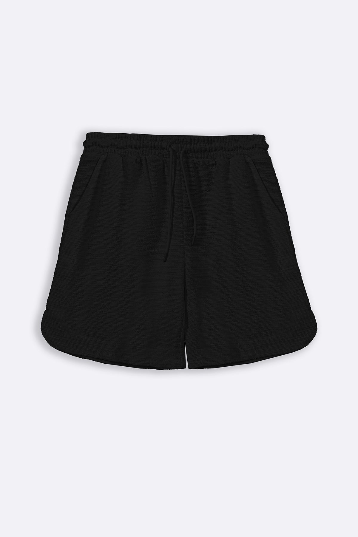 Design details: Boucle knitted shorts with elasticated waistband and drawstring, two side pockets and rear patch pocket with side slits at the hem.
