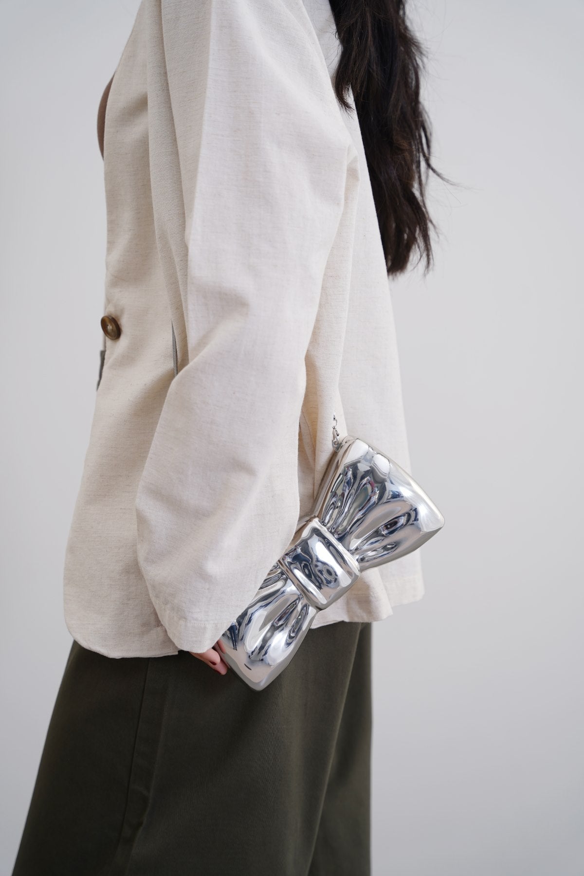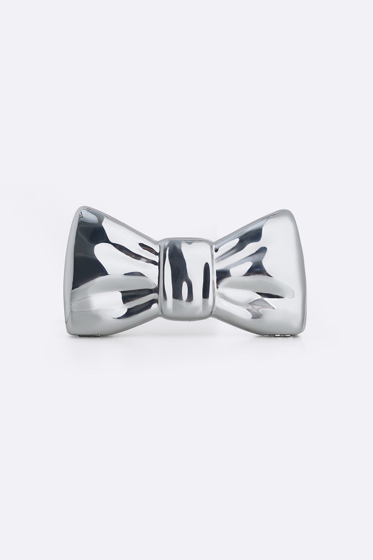 Statement bow shaped mini metal clutch which comes with high quality silver chain.