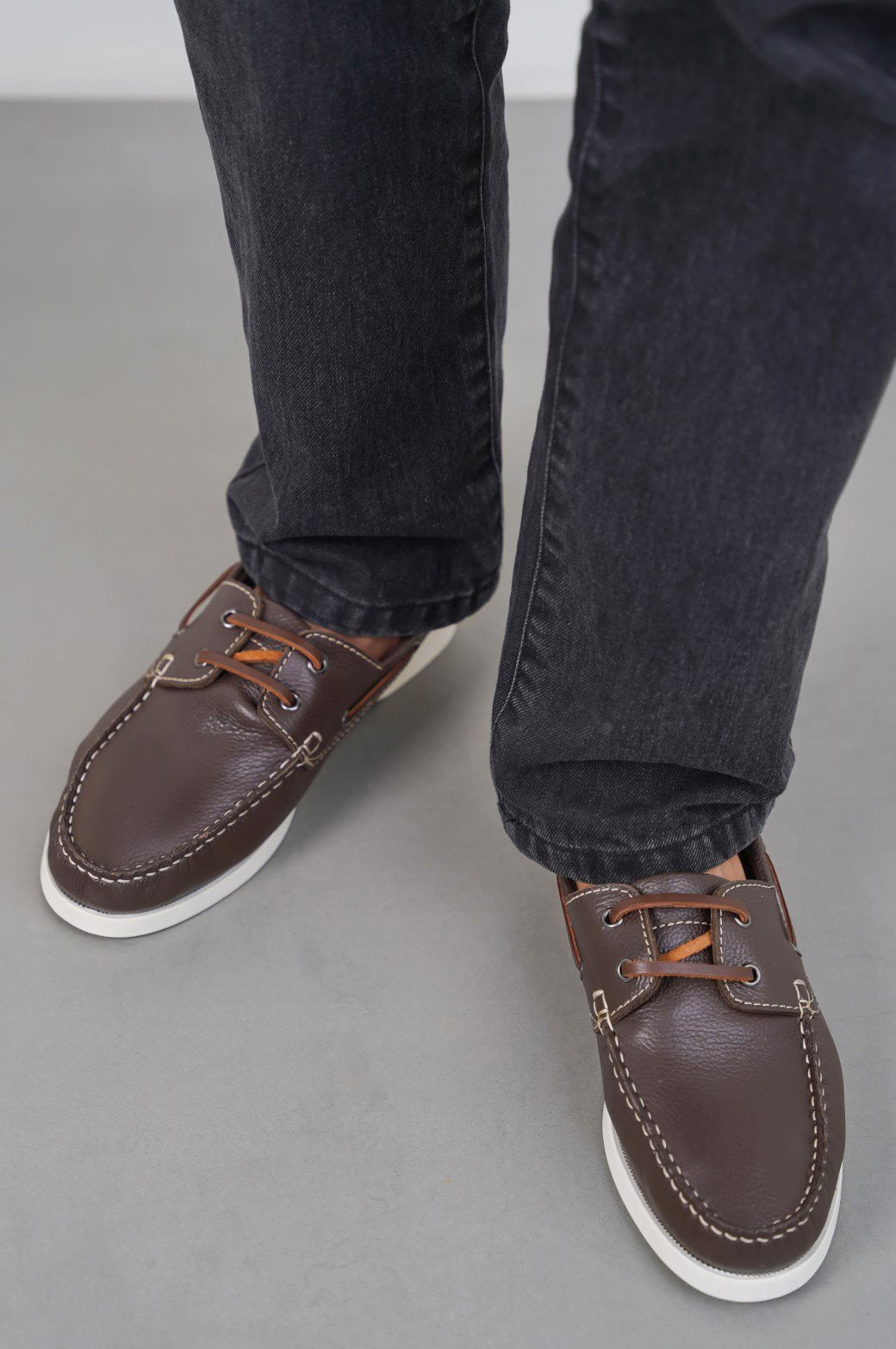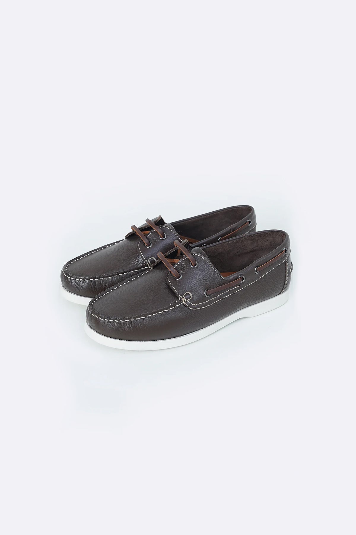 Classic boat shoes with leather laces and white outsole.