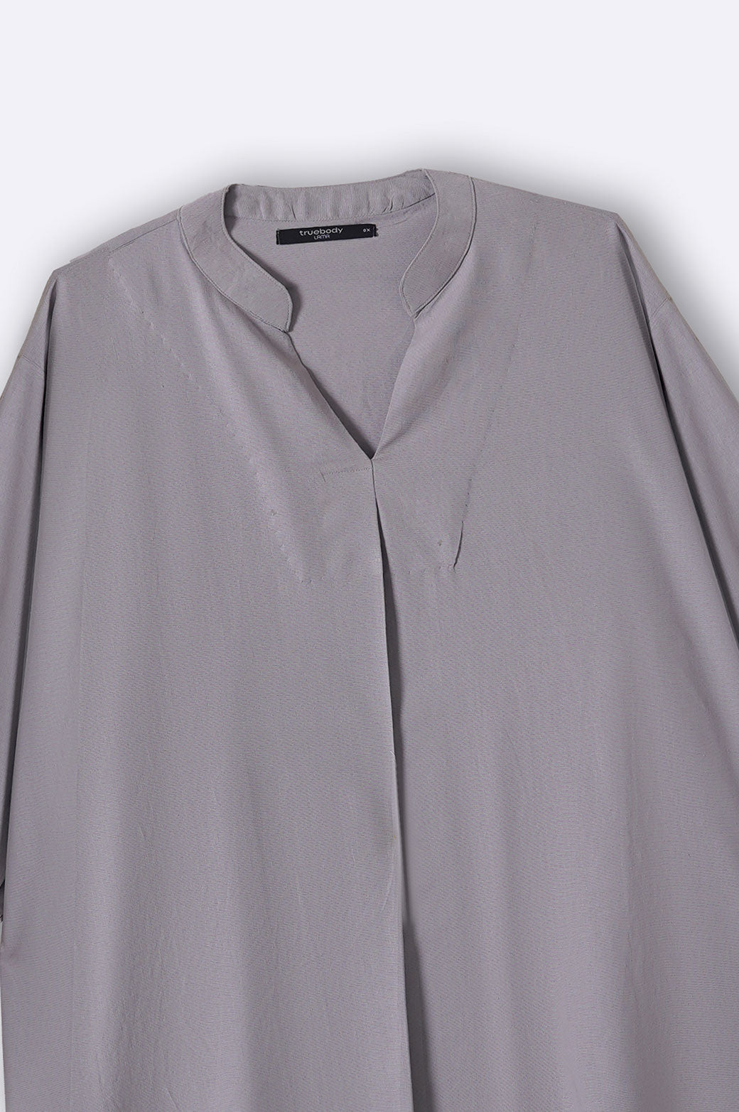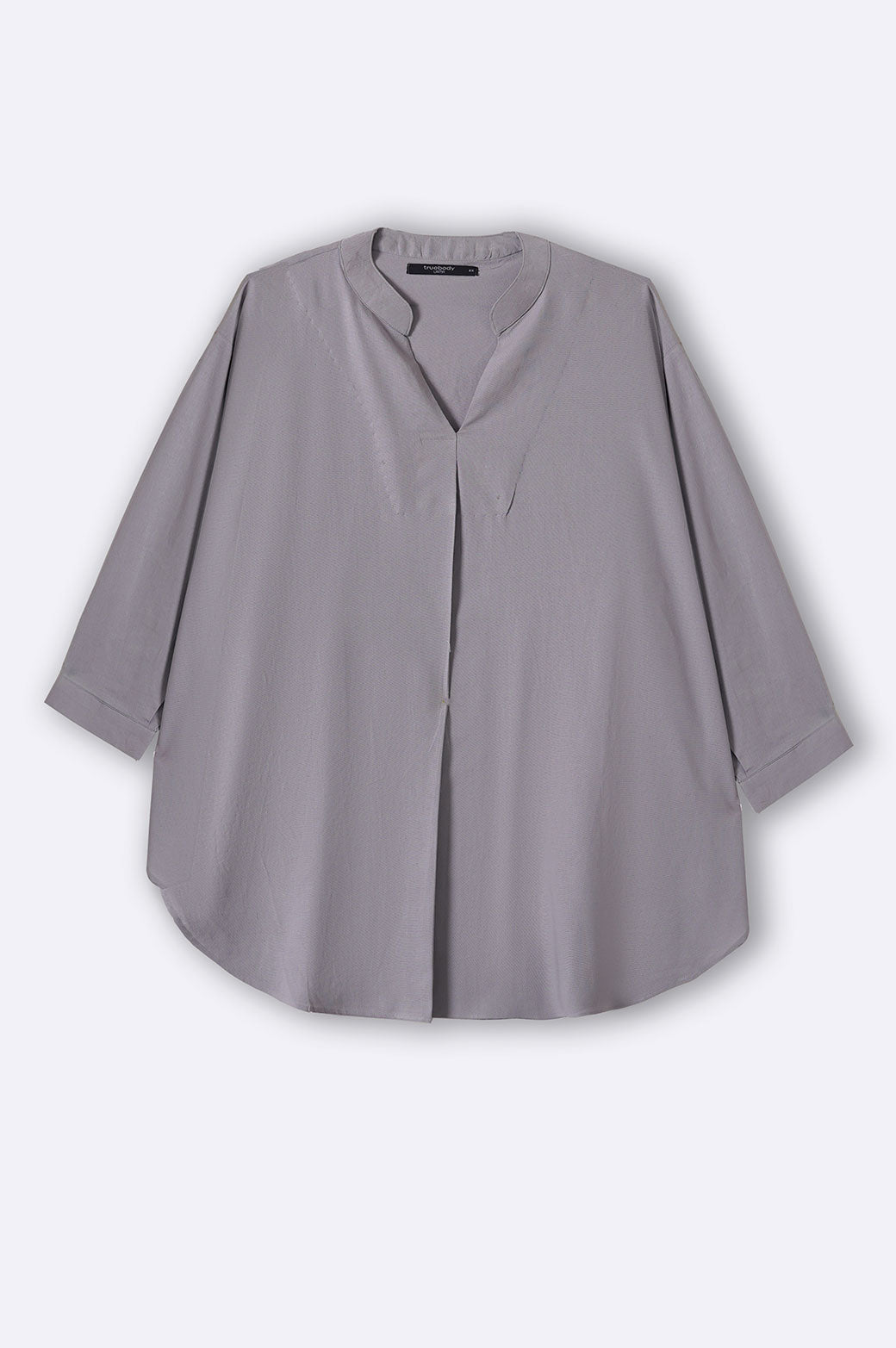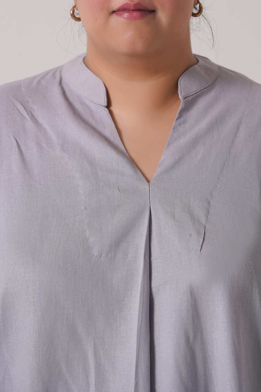 Design details: V neck collared shirt with front inverted box pleat detail.