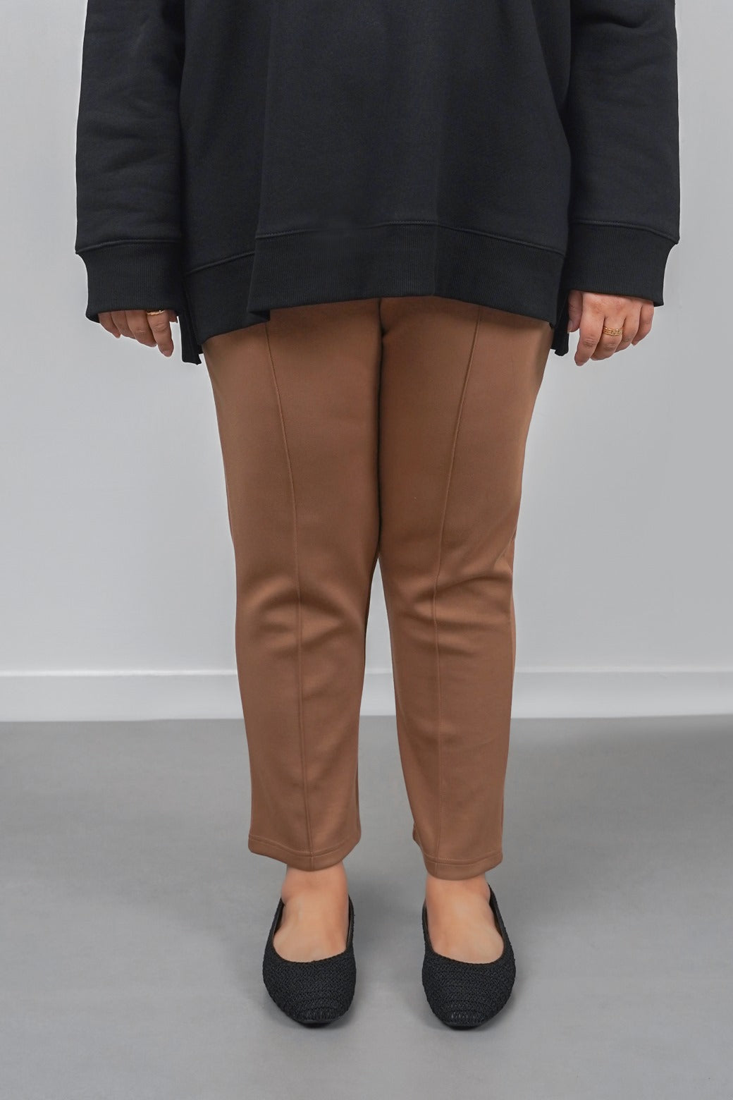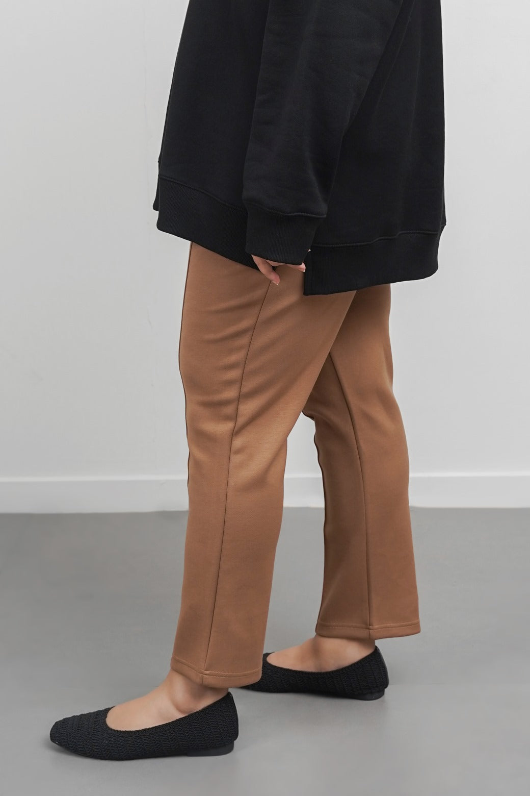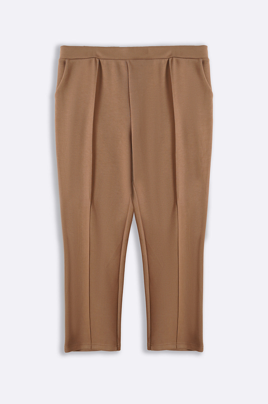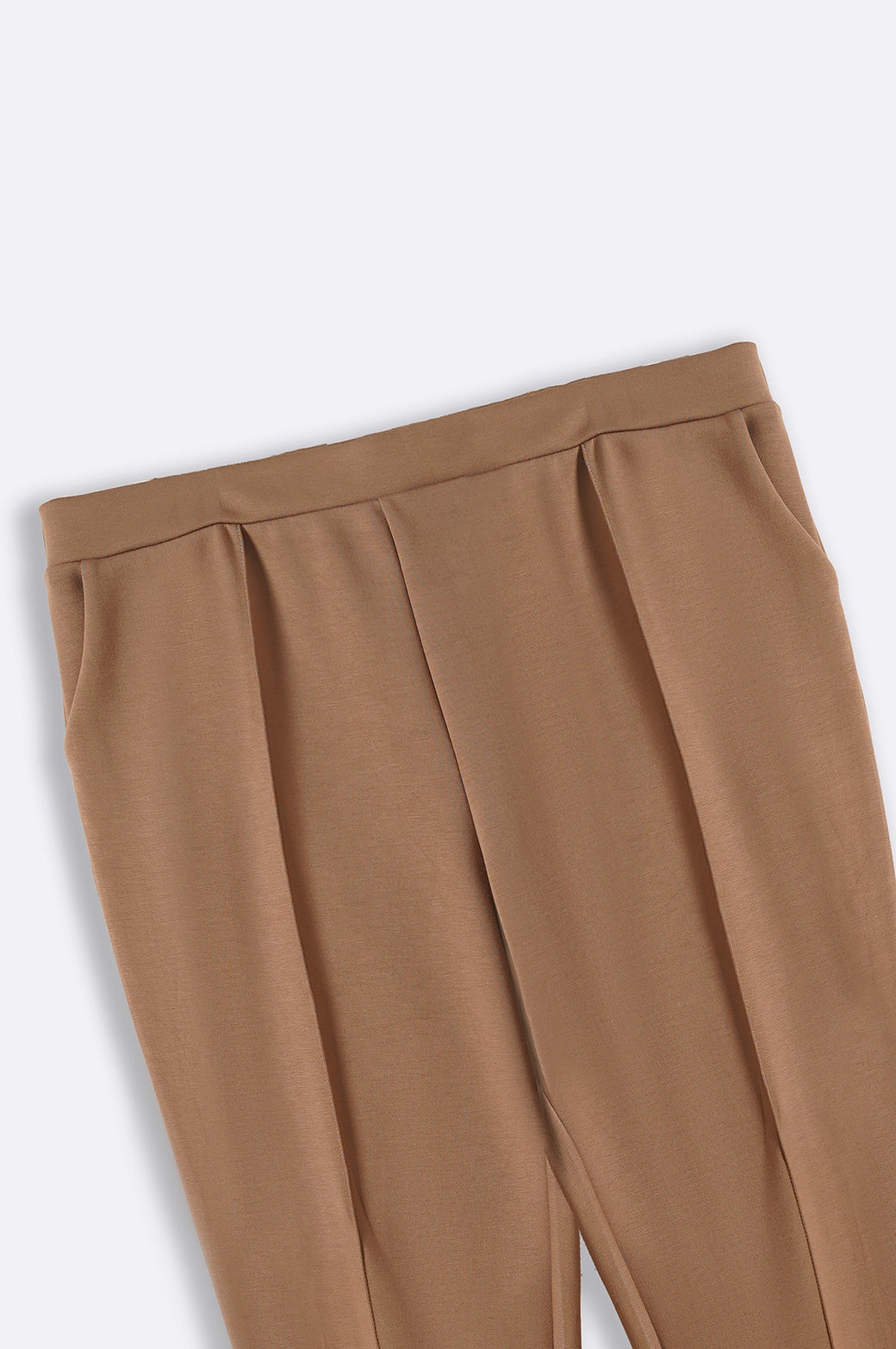 Design details: Neoprene trousers in a stretchy, flexible fabric featuring mid-waist and elasticated waistband. Pleats on the center front of the bottoms