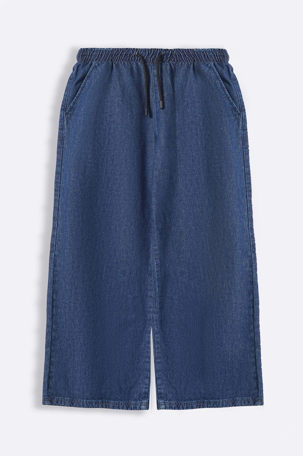 Design Details: High waisted wide leg jeans with elasticated waist band and draw string. There are cross pockets at front.