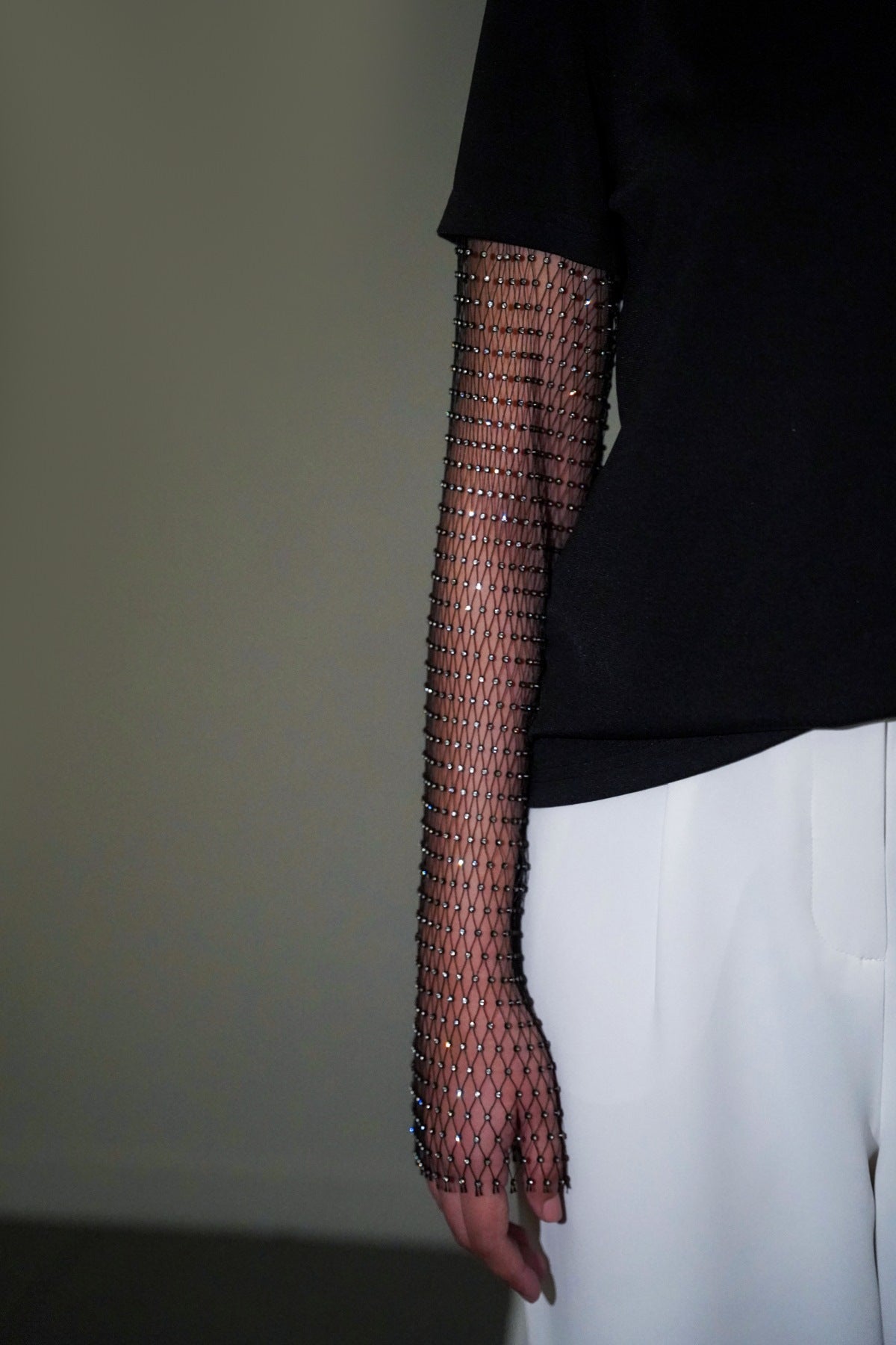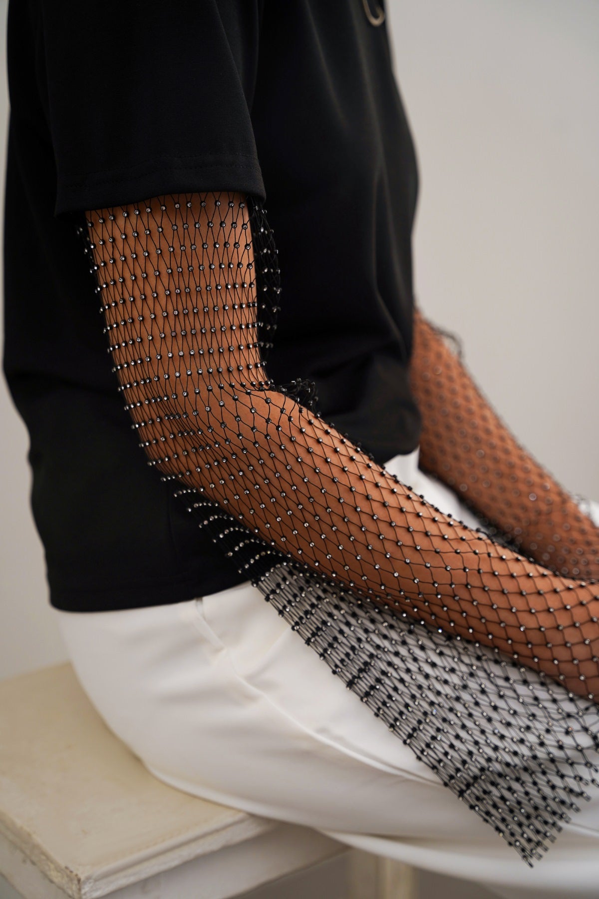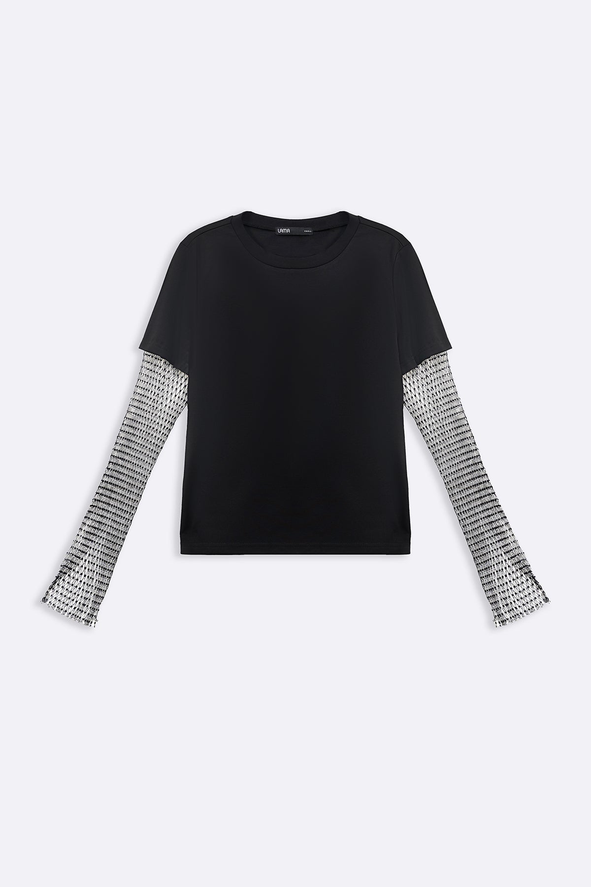 Design details: Crew-neck tee with short sleeves and mesh rhinestone sleeve detailing.