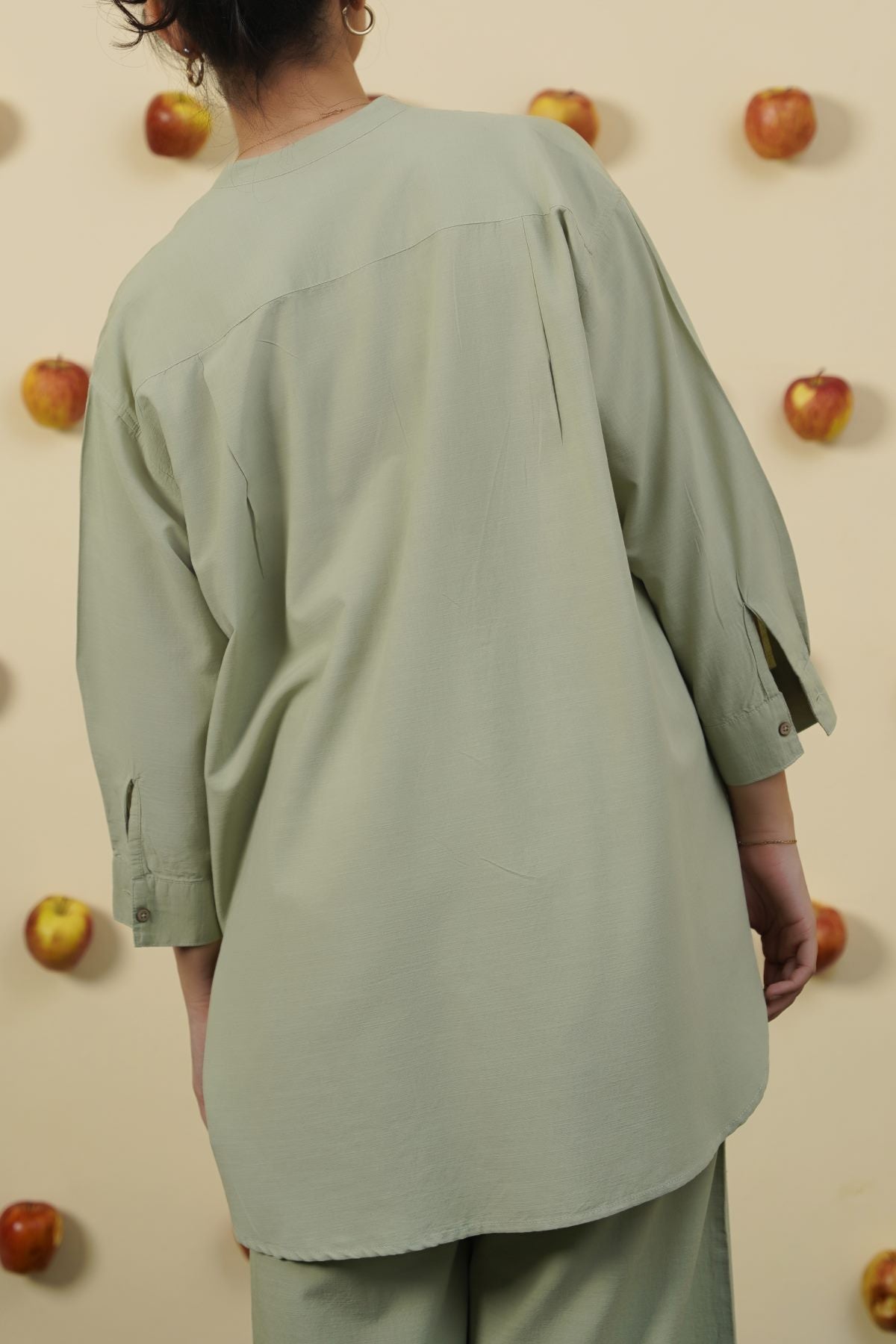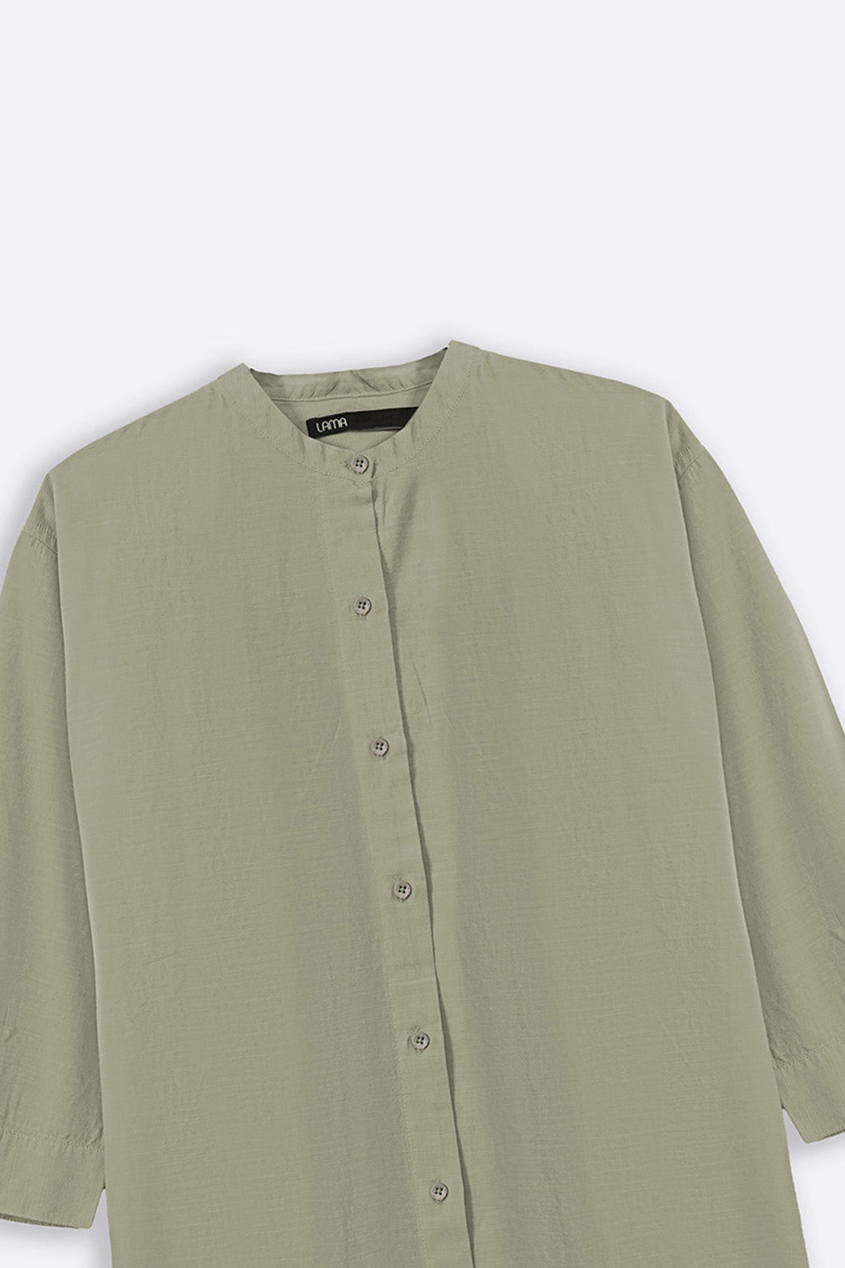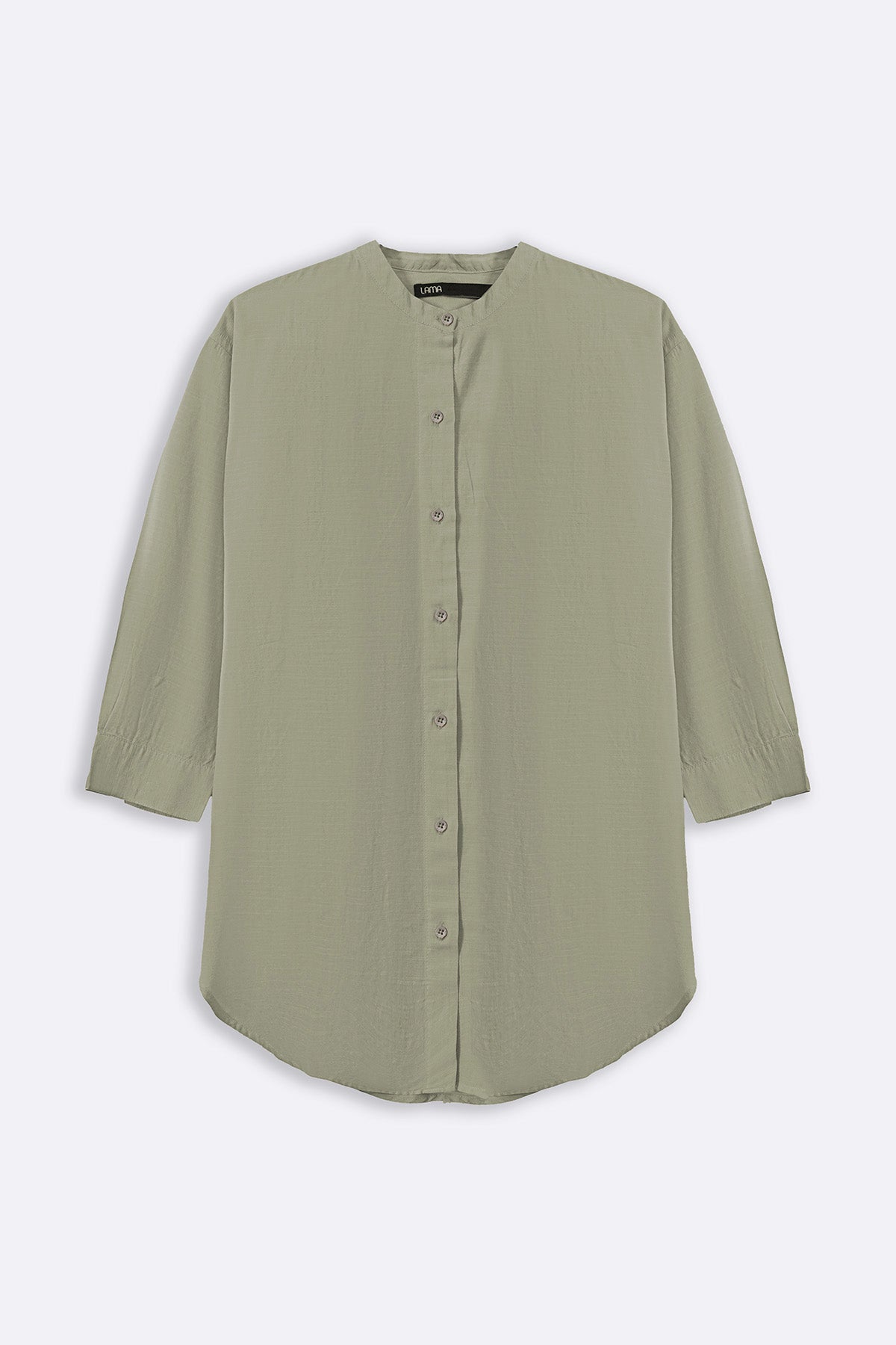Design details: Band collar shirt with round hem, three quarter sleeves and wooden button front closure and cuff detail