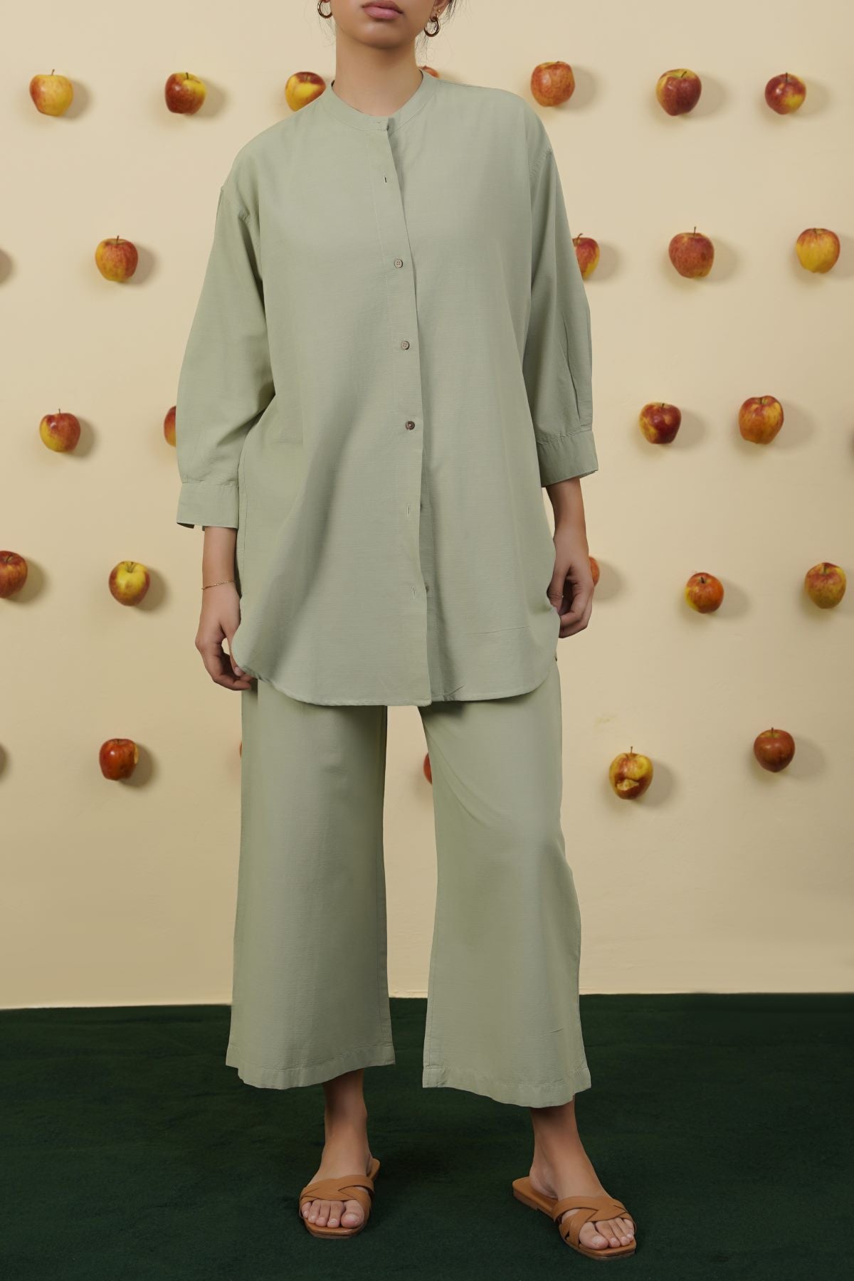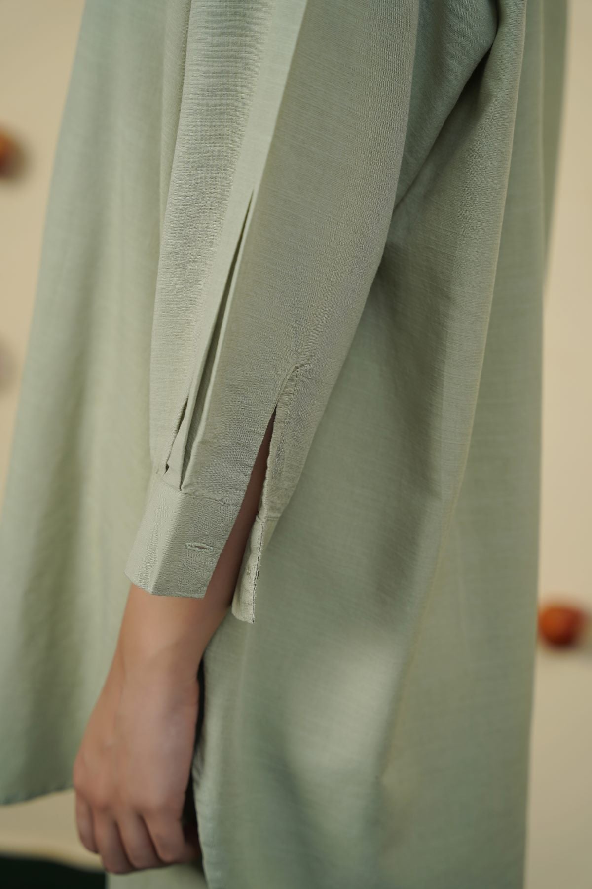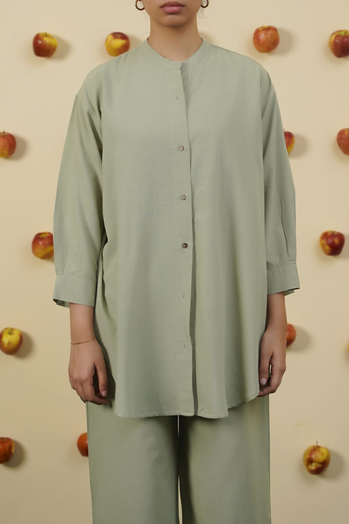 Design details: Band collar shirt with round hem, three quarter sleeves and wooden button front closure and cuff detail