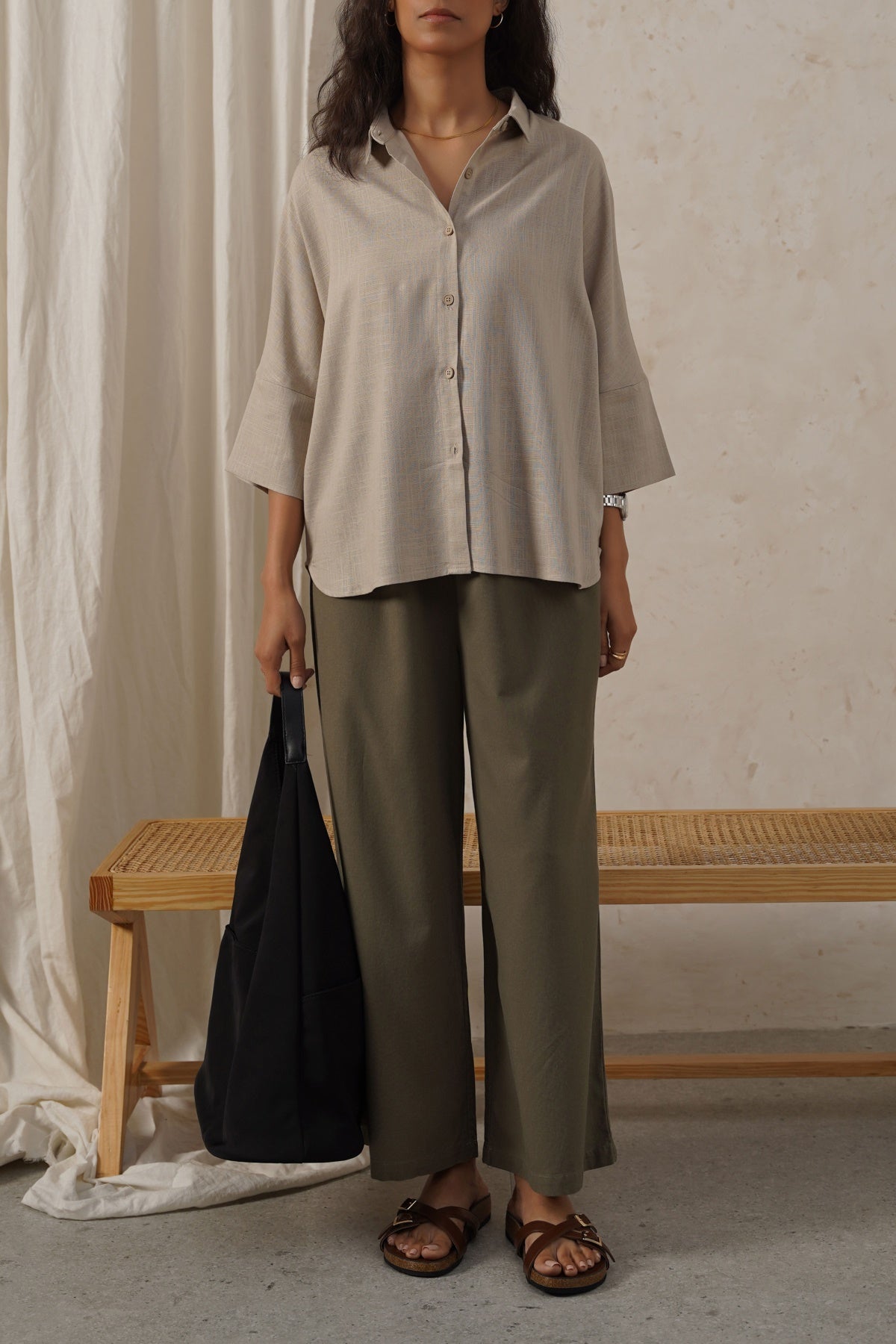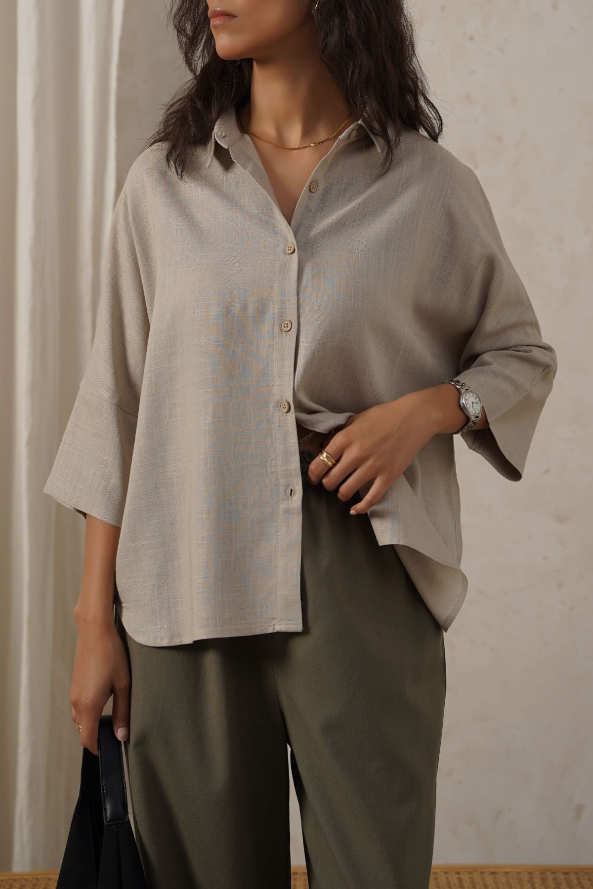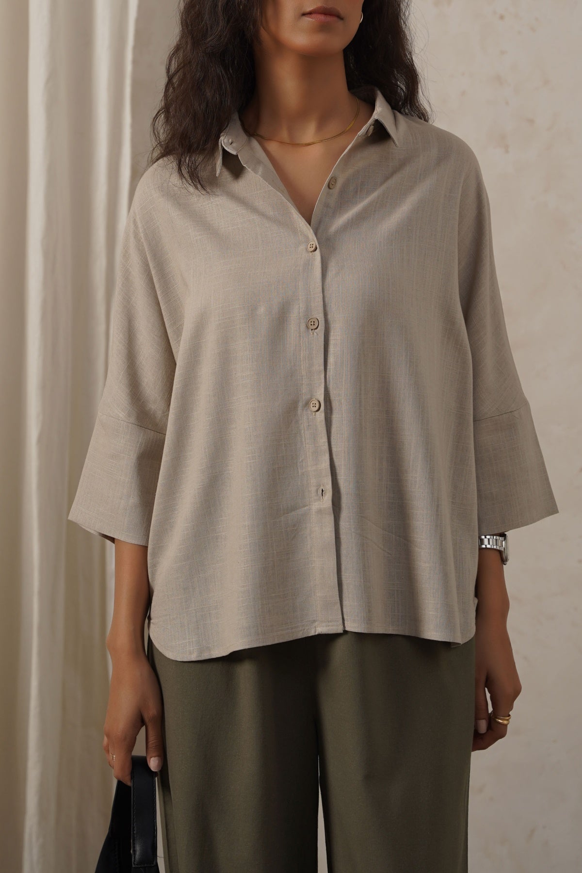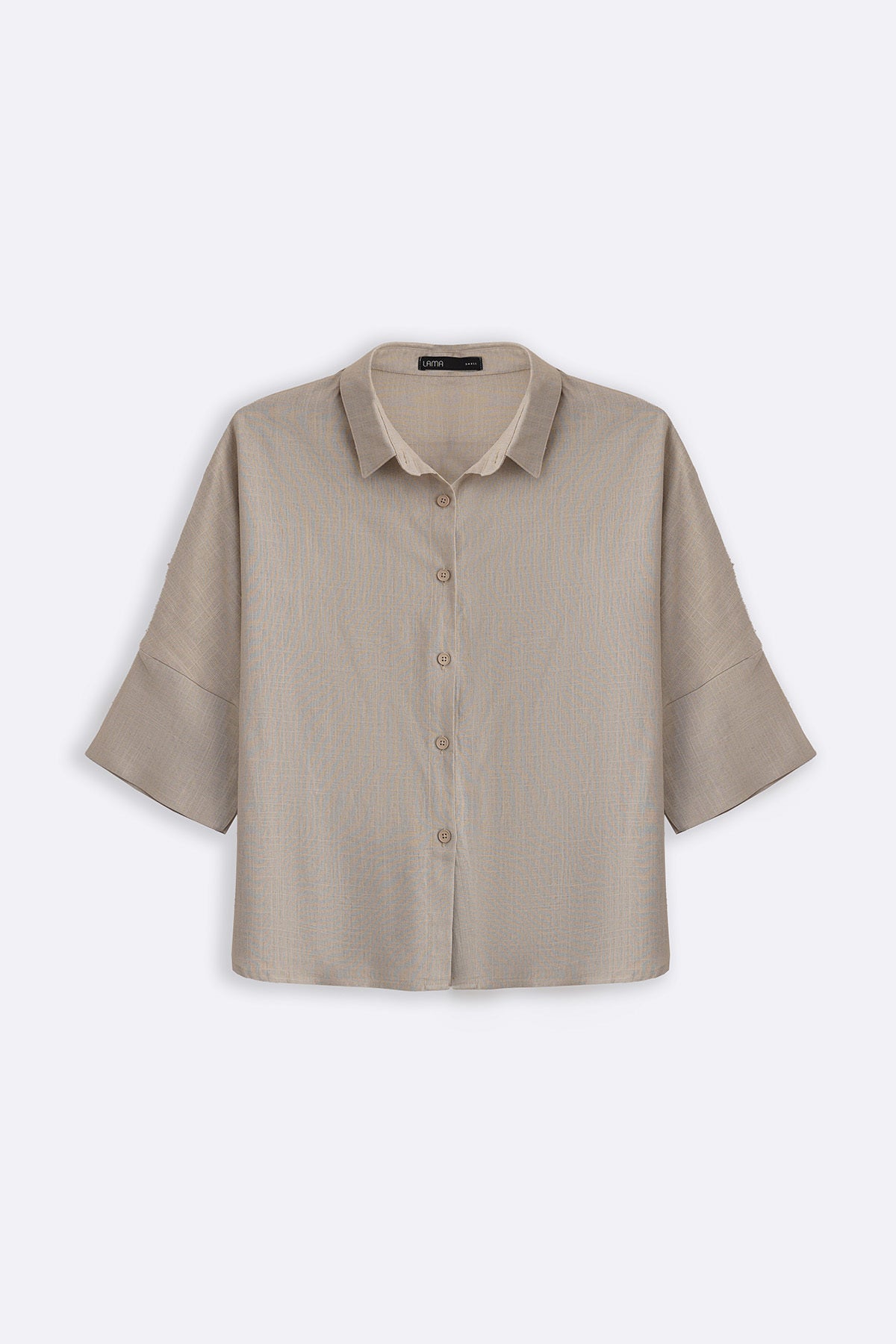 Design details: Button down shirt with collar, three quarter sleeves, and back box pleat. Batwing cutline without an armhole.