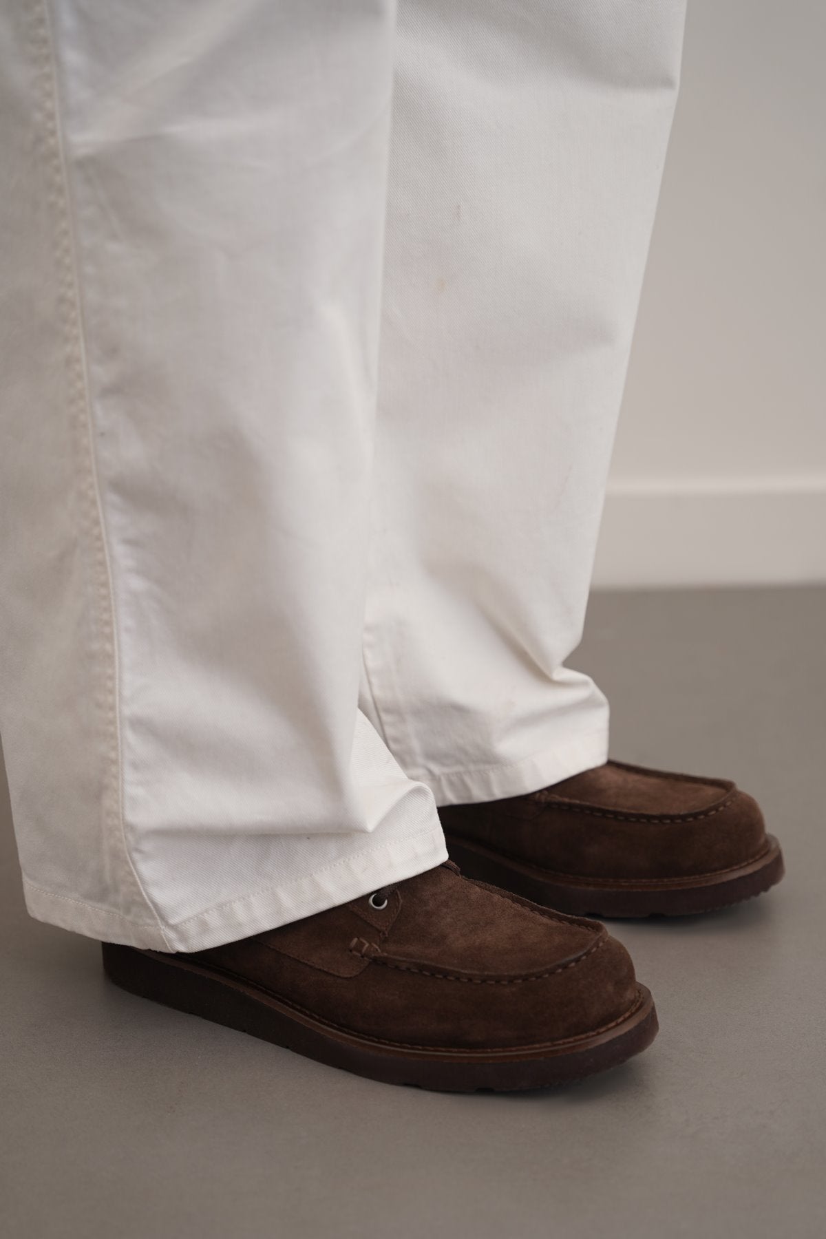 For stains, use a shoe cleaner with a damp cloth followed by shoe renovator.