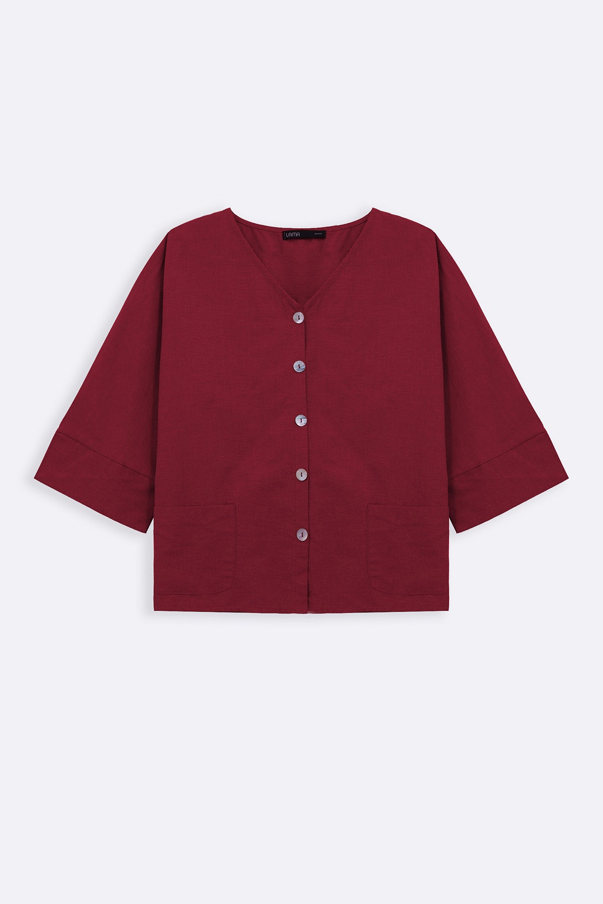 Design details: V-neck blouse with three quarter sleeves, front pearl button closure and a single patch pocket.