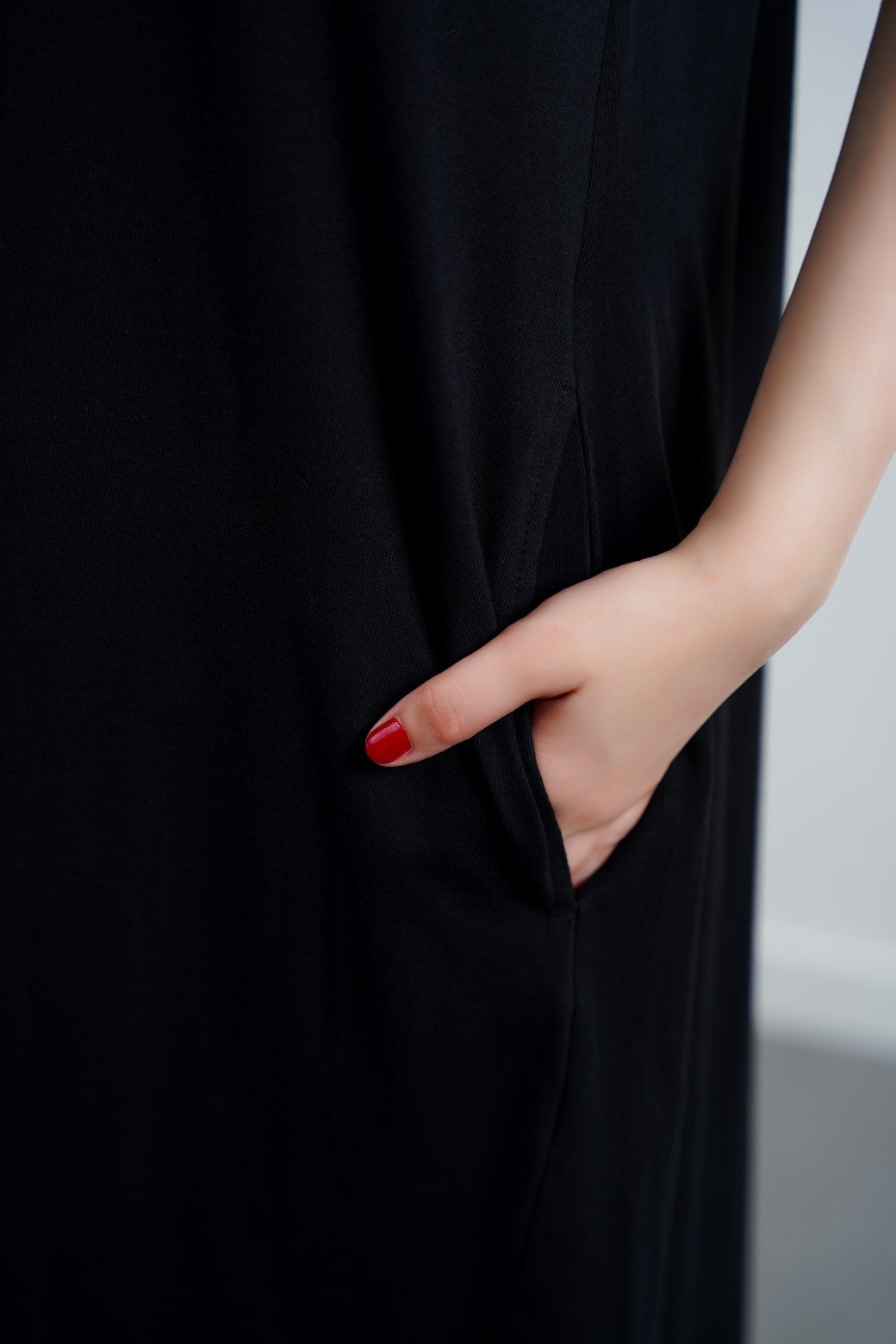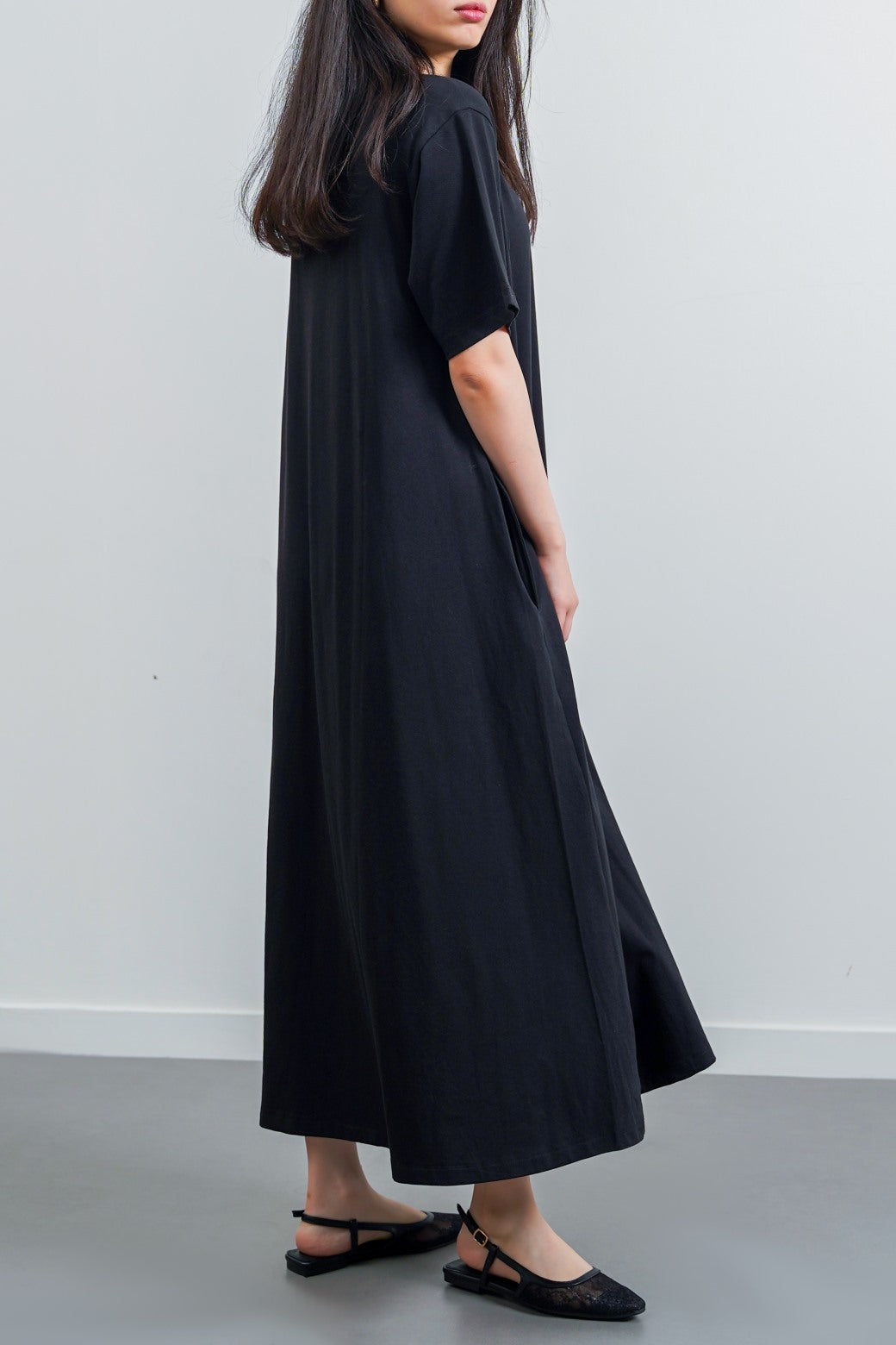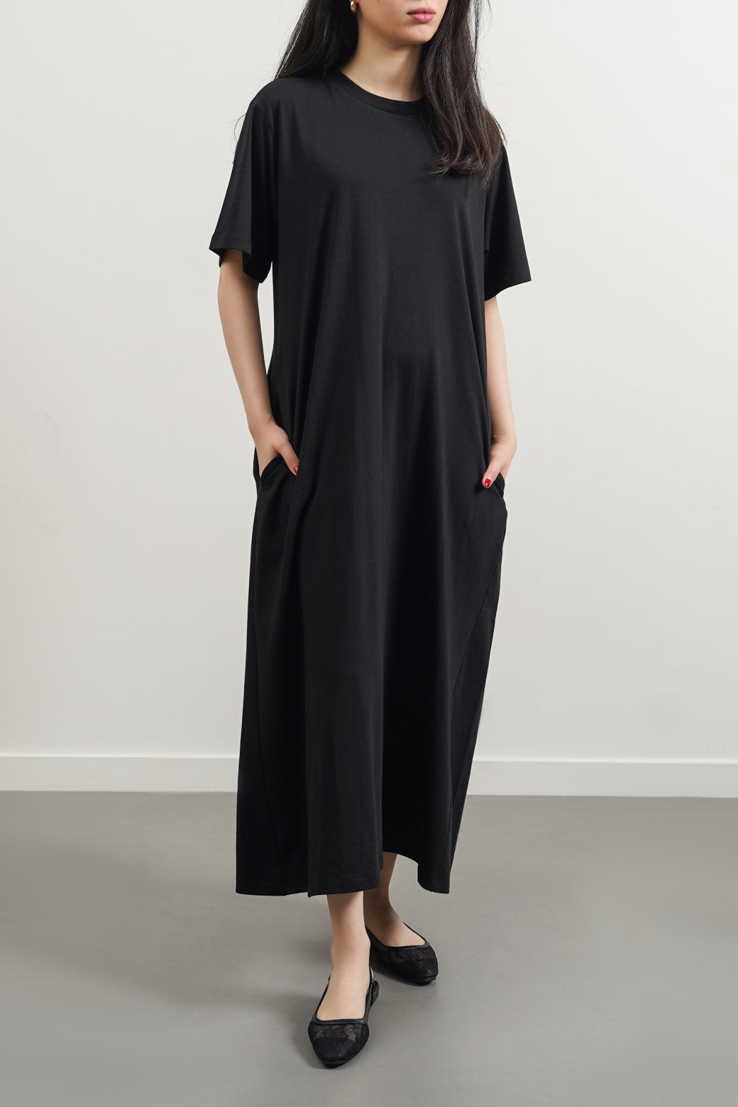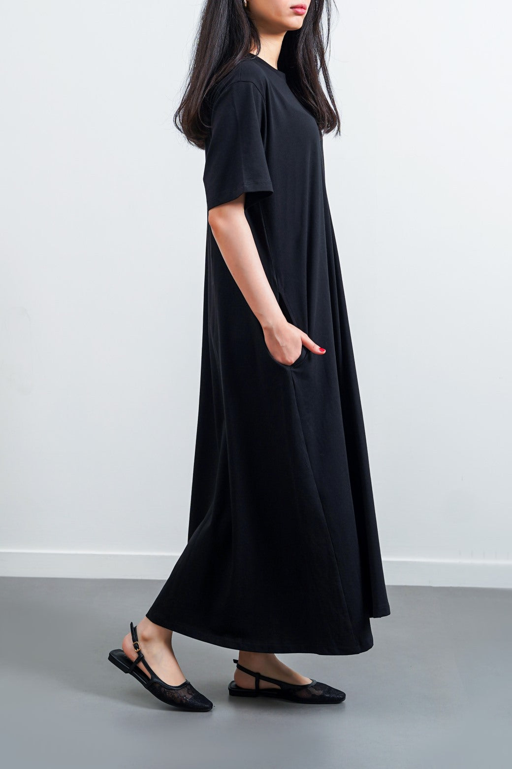Design details: Crew neck neckline long dress with short sleeves featuring side pockets