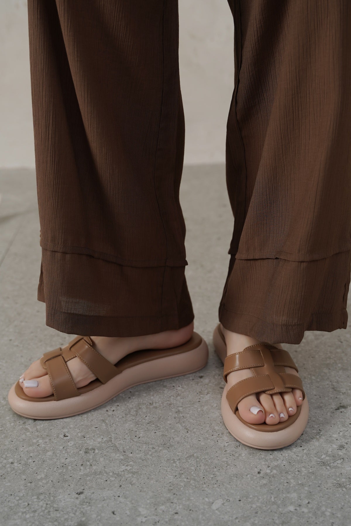 Super soft and lightweight mama platform slides with a strappy pattern.