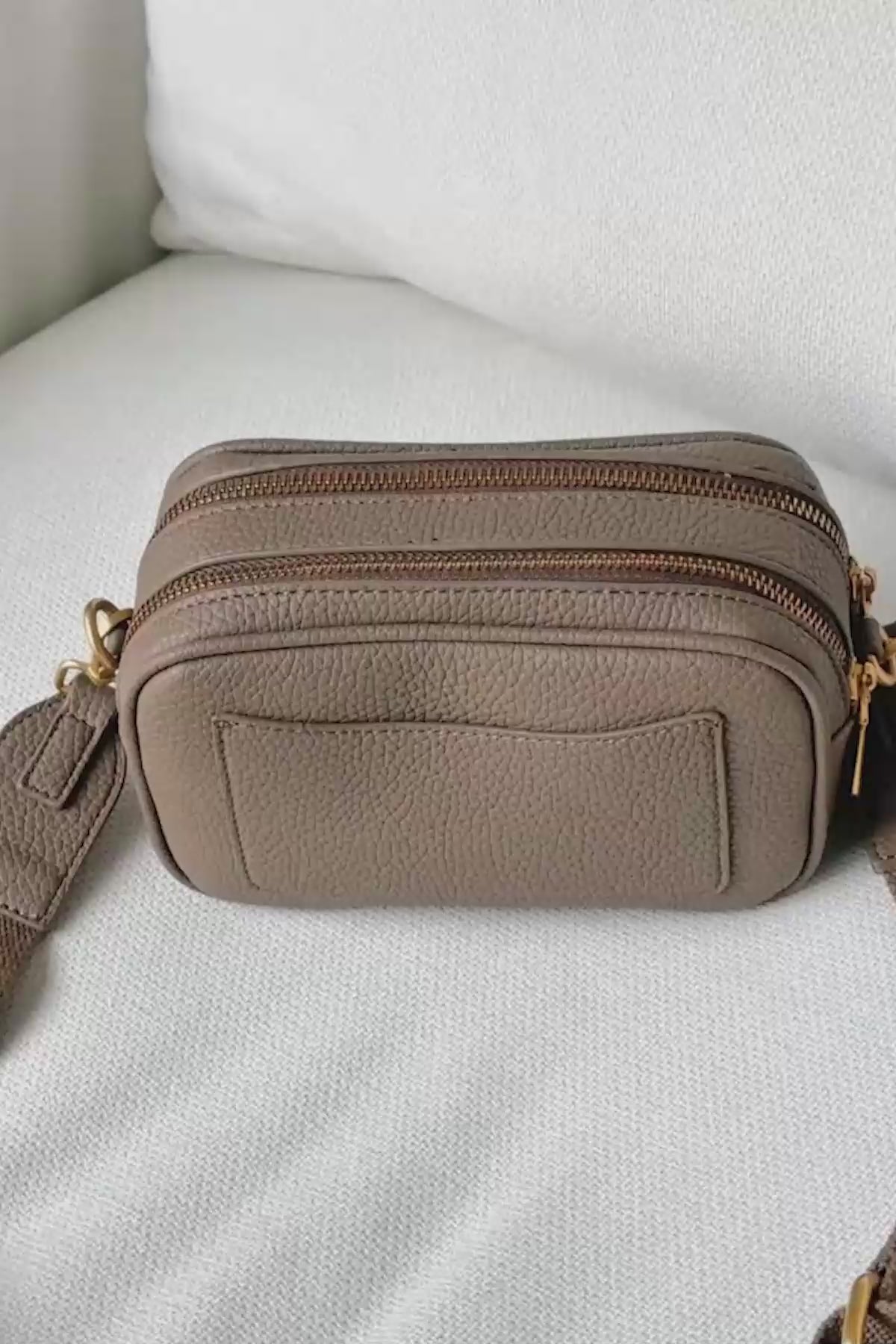 Compact but roomy, double zip crossbody bag with wide adjustable canvas strap. One external pocket for handy items with multiple inner pockets make this a top choice for hands free convenience.
