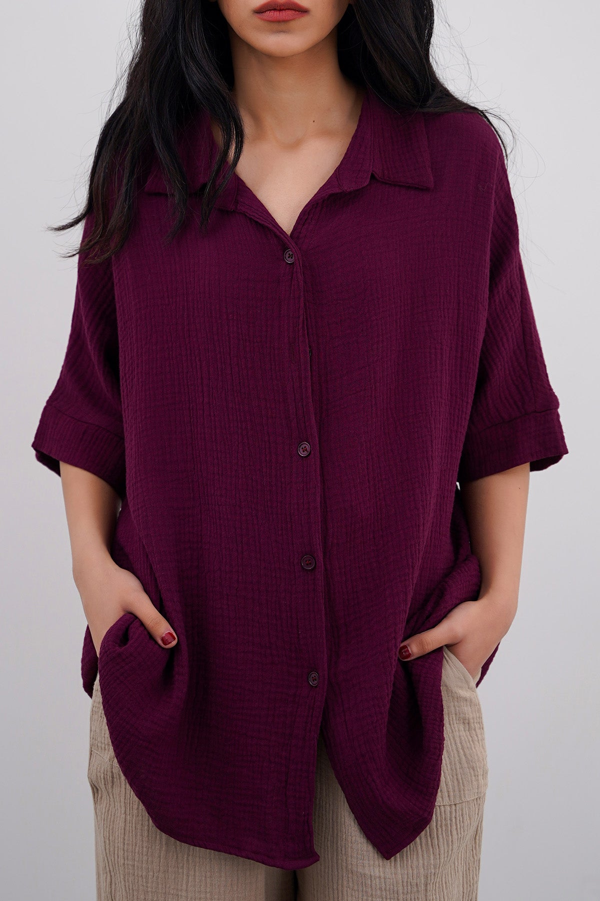 Design details: Solid muslin collared button down blouse with short sleeves. One piece batwing cutline without an armhole.