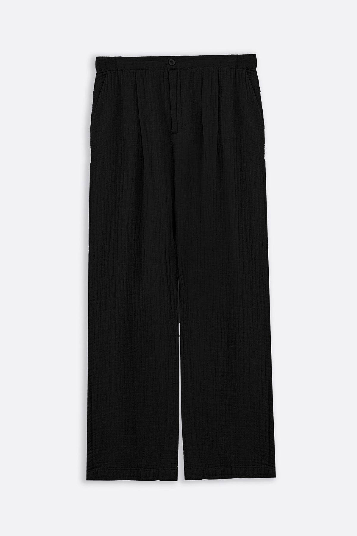 Design details: Relaxed muslin trousers with cross pockets and pleats at front. Elasticated waist band with drawstring