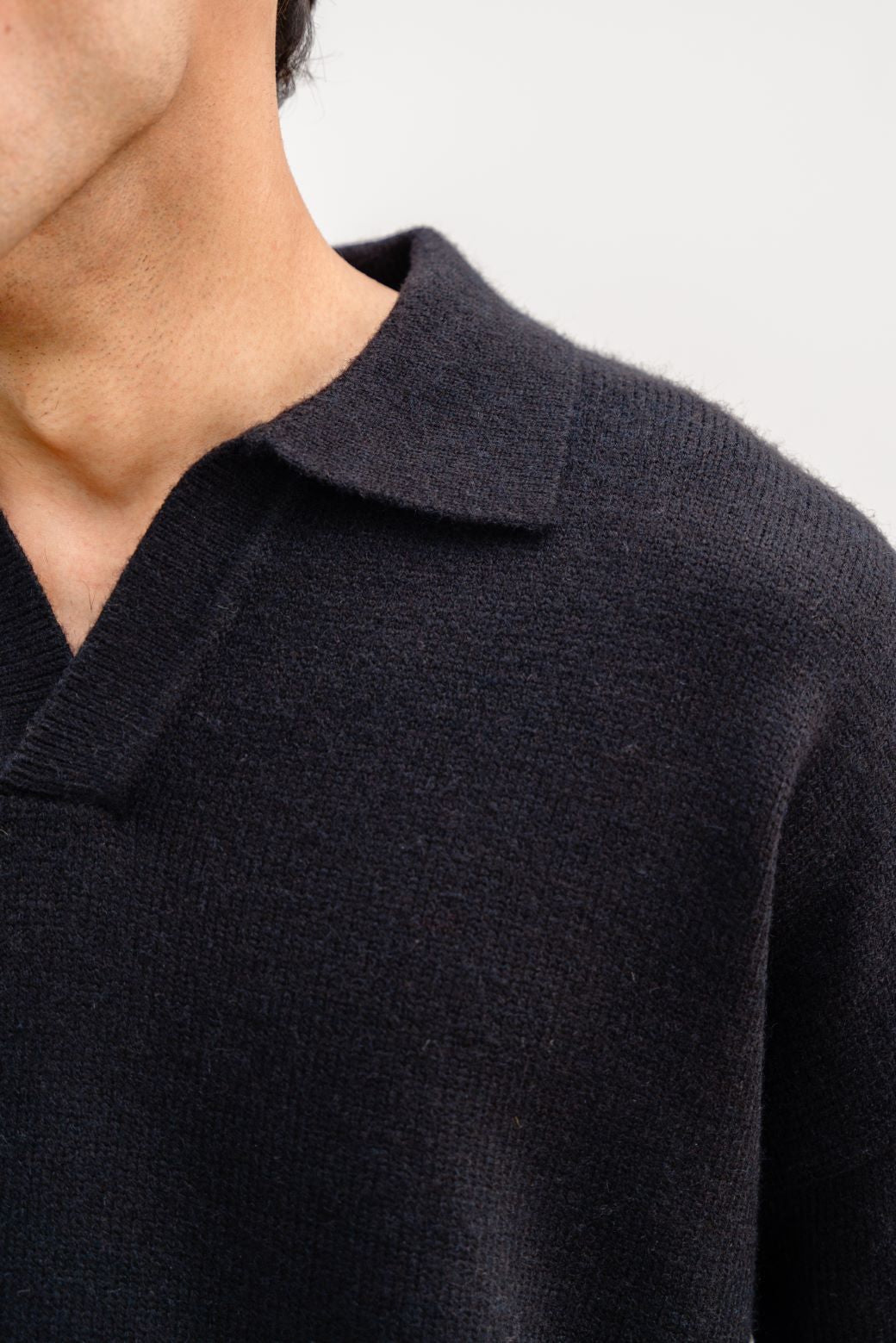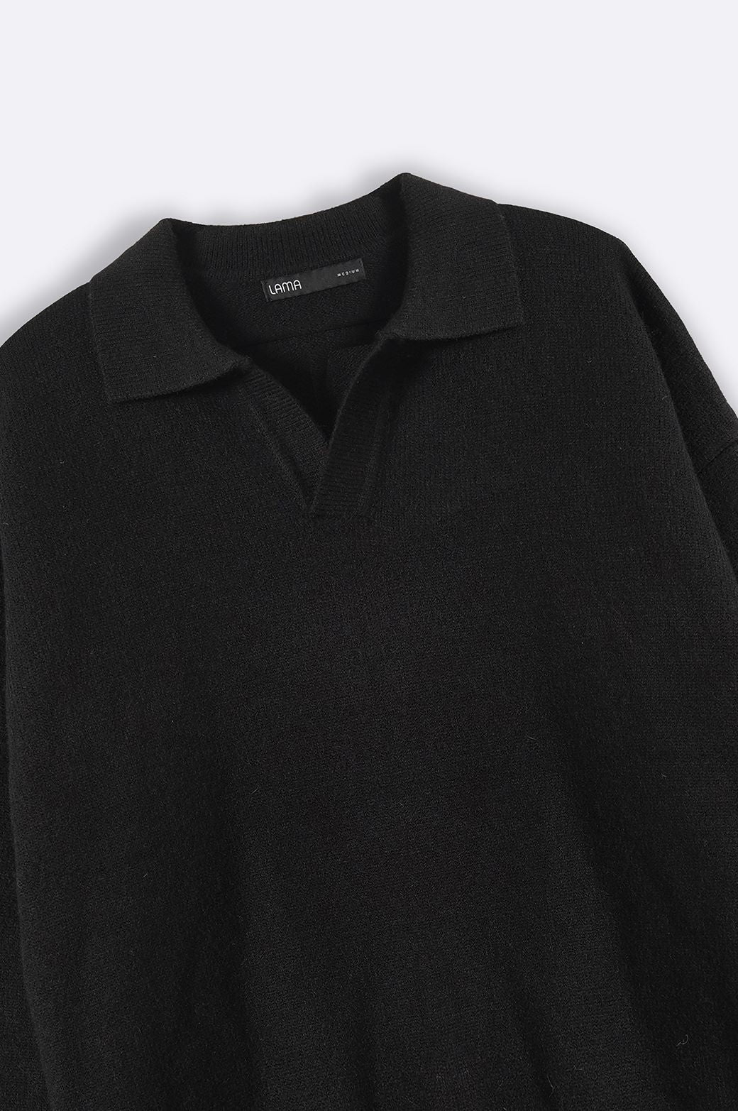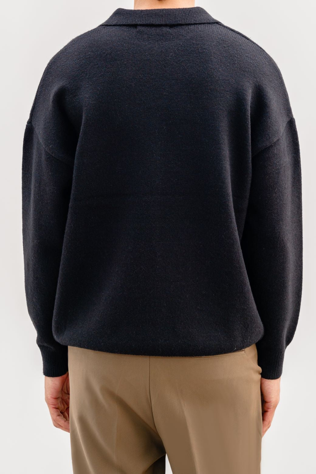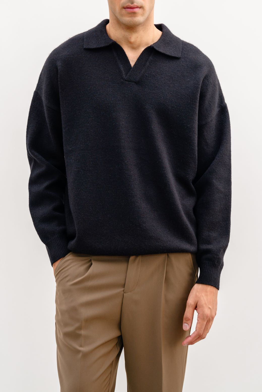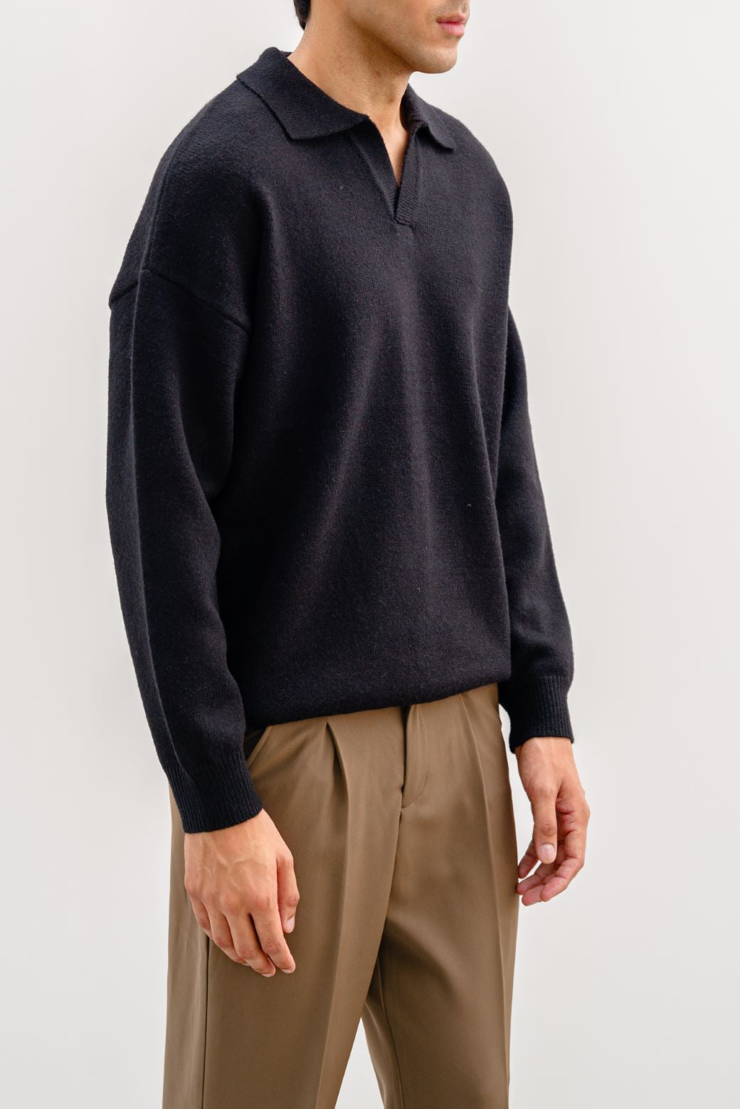 Design details: Super soft, drop-shoulder long-sleeve sweater, Johnny collar with ribbed trim details