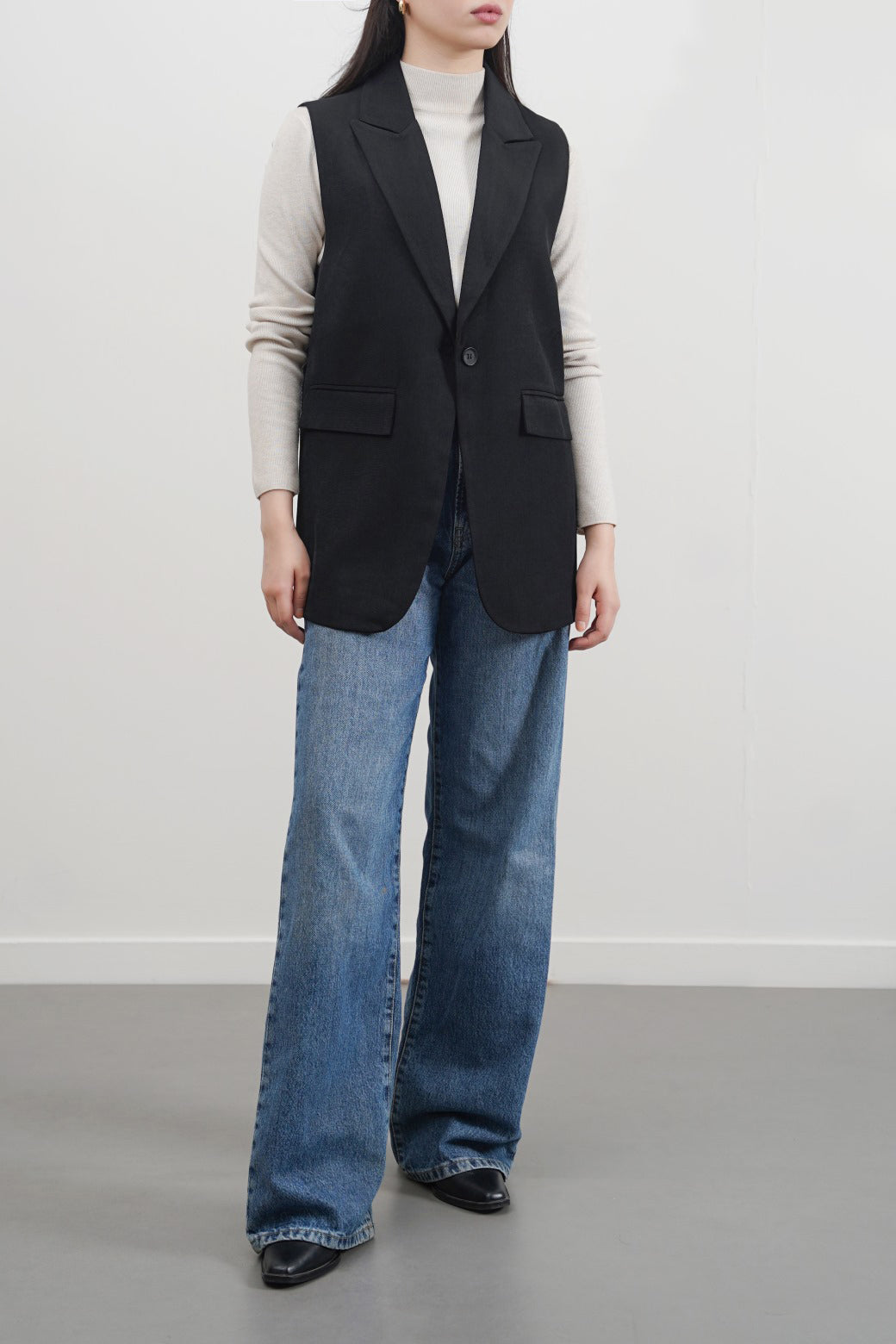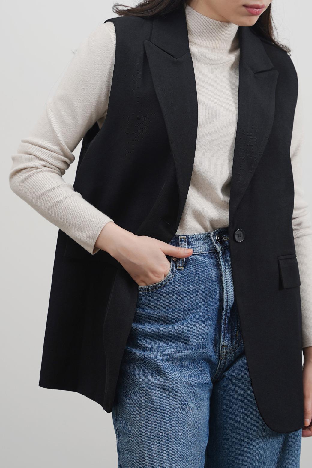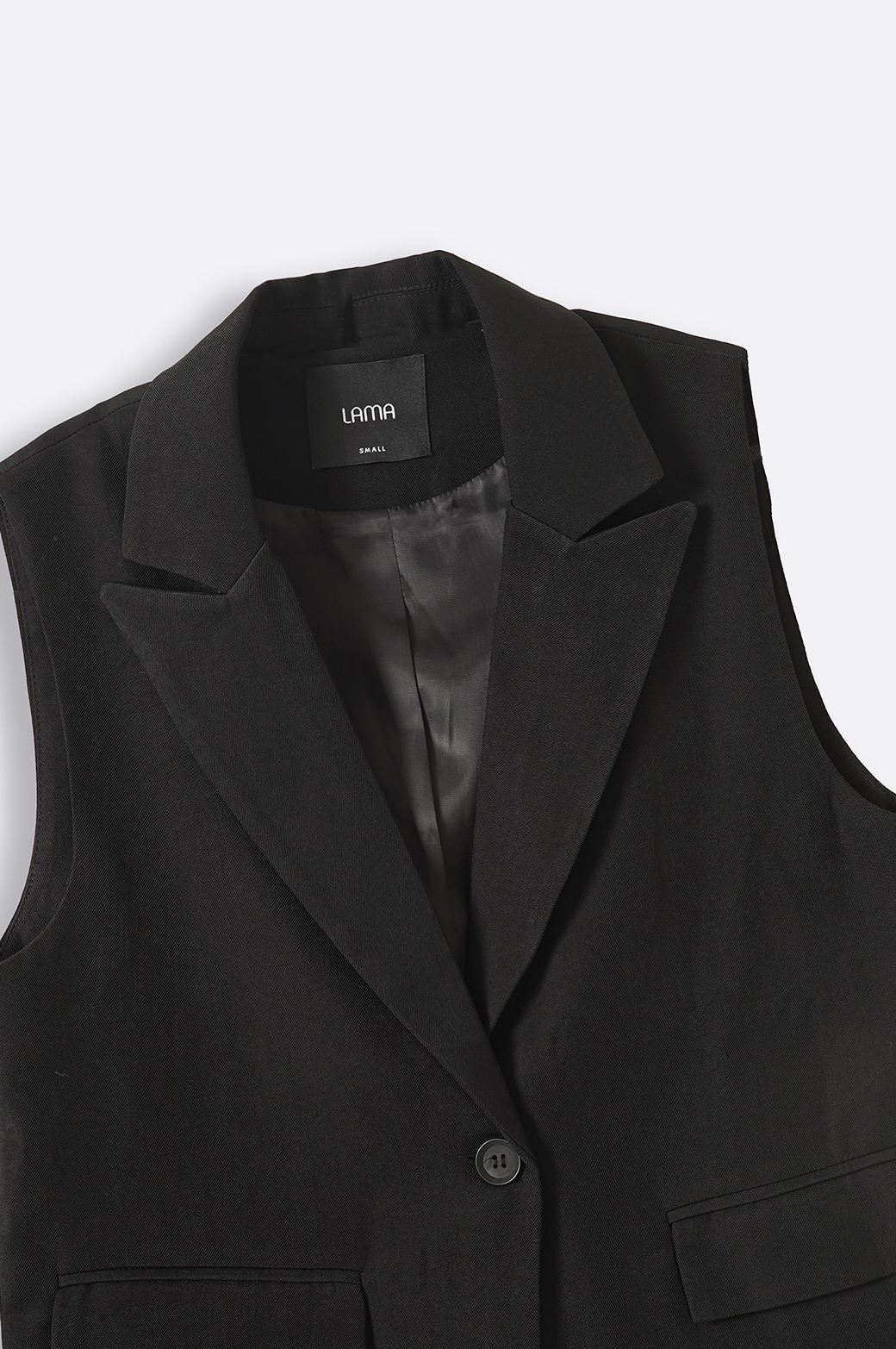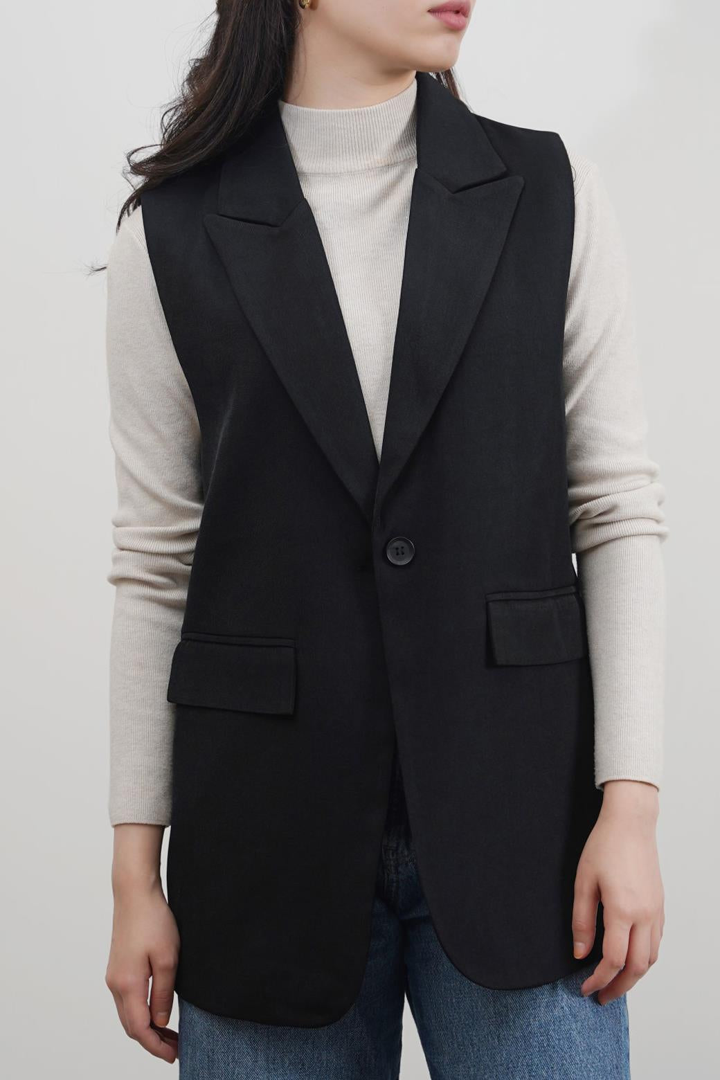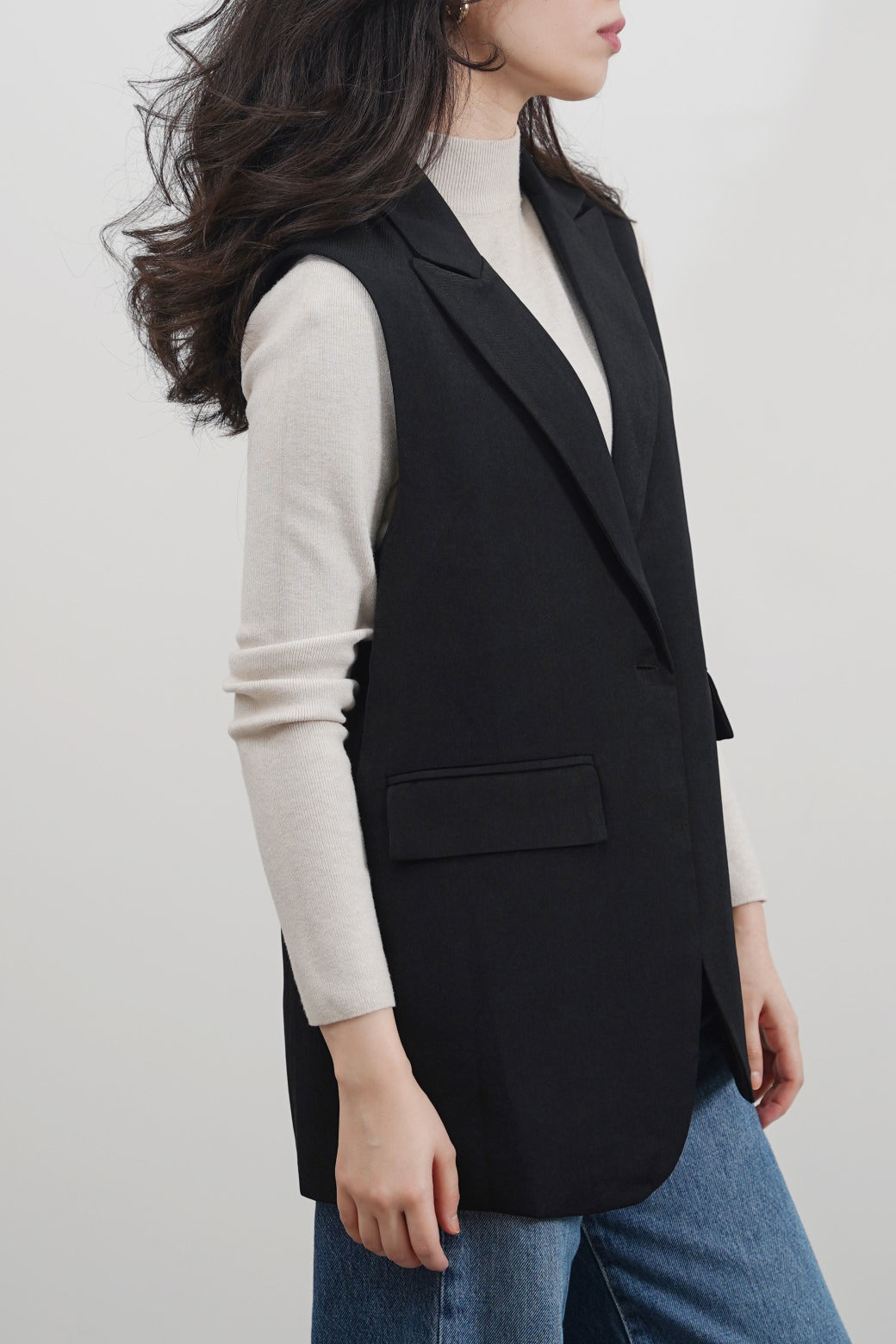 Design details: Sleeveless blazer with a notch collar. Featuring false front welt pockets, back vent slit detail and front button closure.