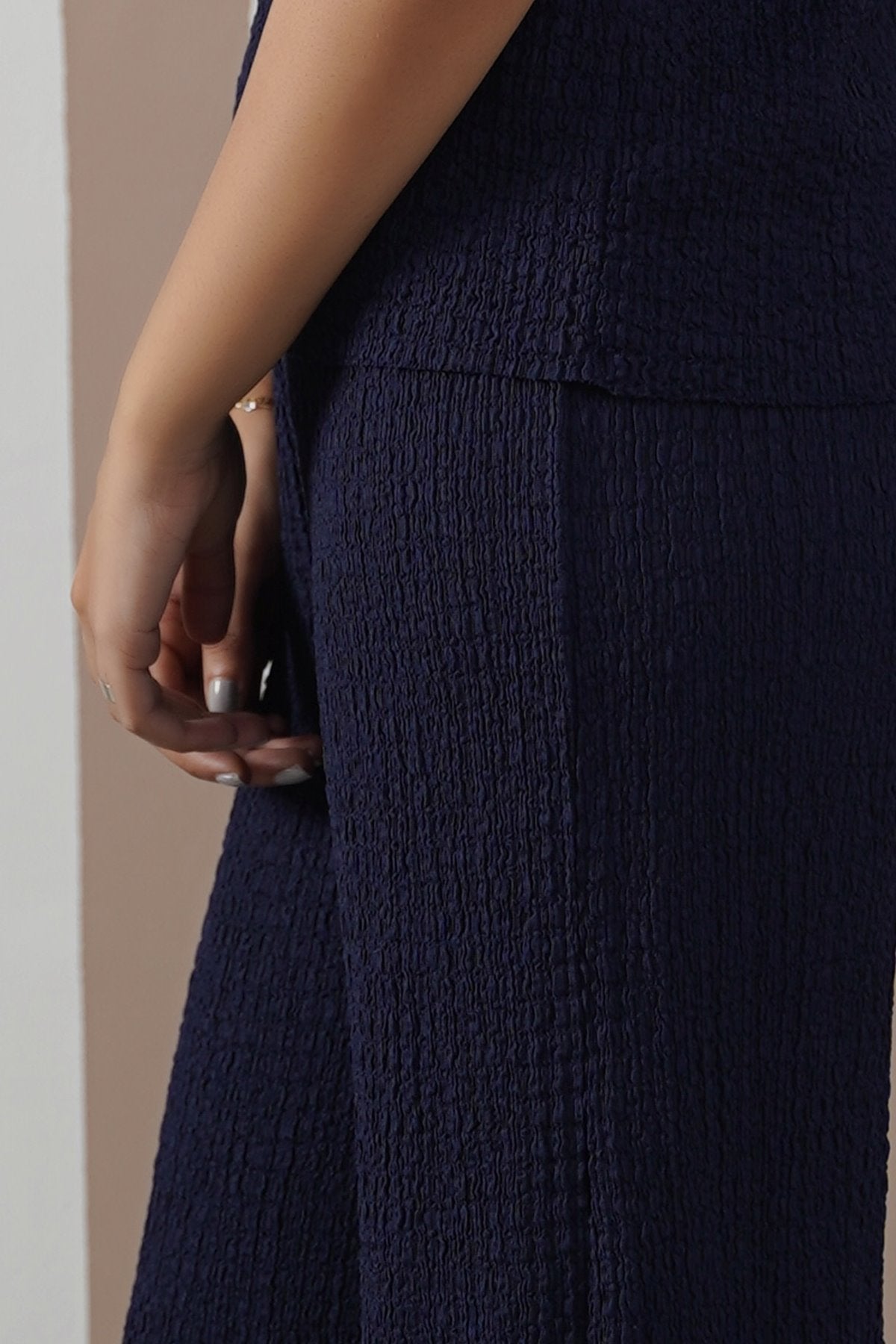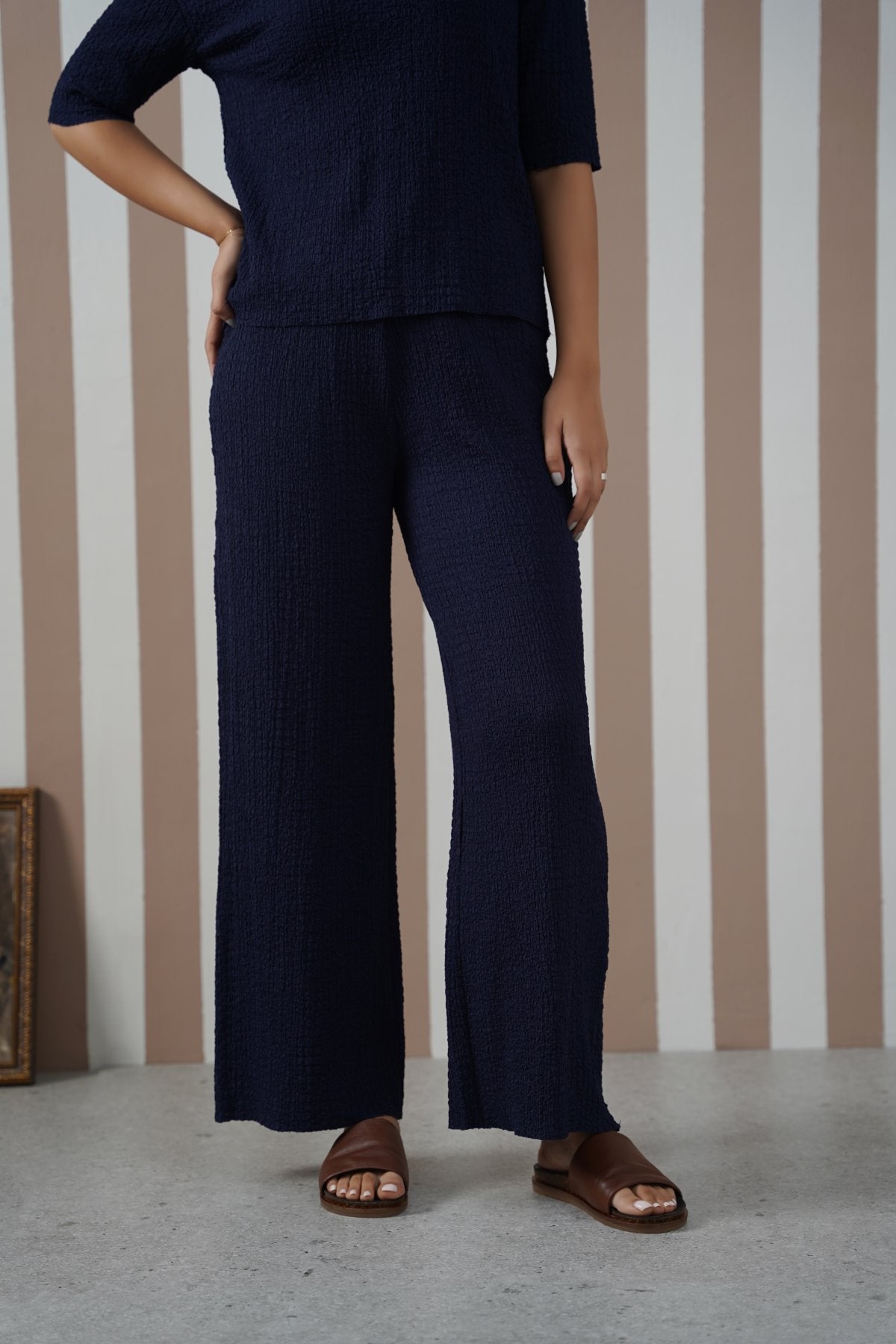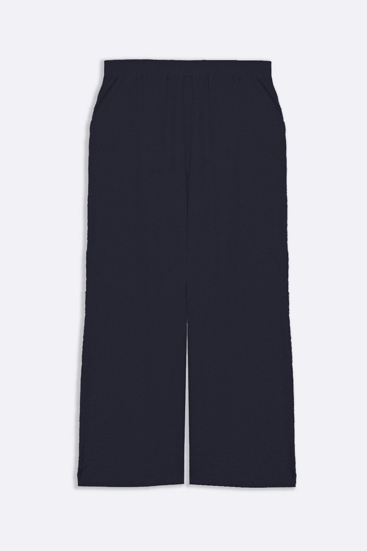 Design details: Premium crinkle fabric straight cut, relaxed pants with fully elasticated waistband. Unfinished hem detail.
