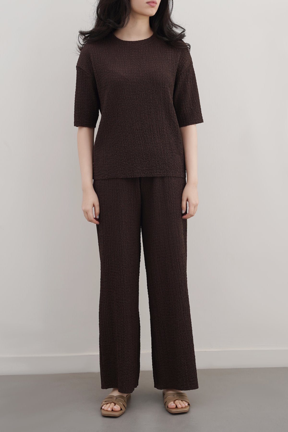Design details: Premium crinkle fabric with crew neckline and short sleeves that can be worn formally.