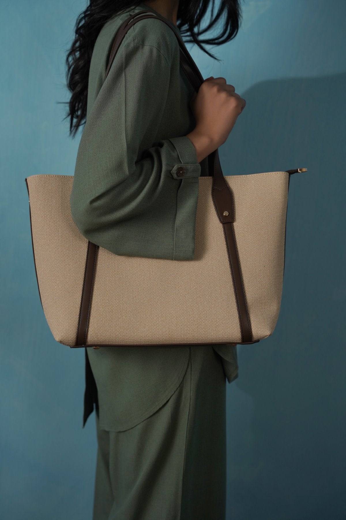 Functional and spacious, soft tote bag with two slip pockets on either side of the main section and with a magnetic snap button closures. The main section has a zip on top along with two inner pockets to hold your belongings.