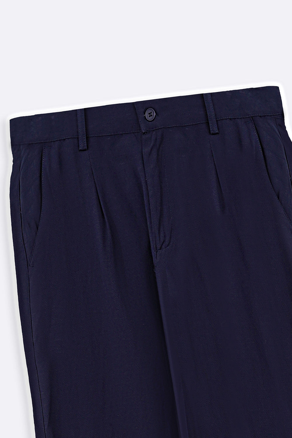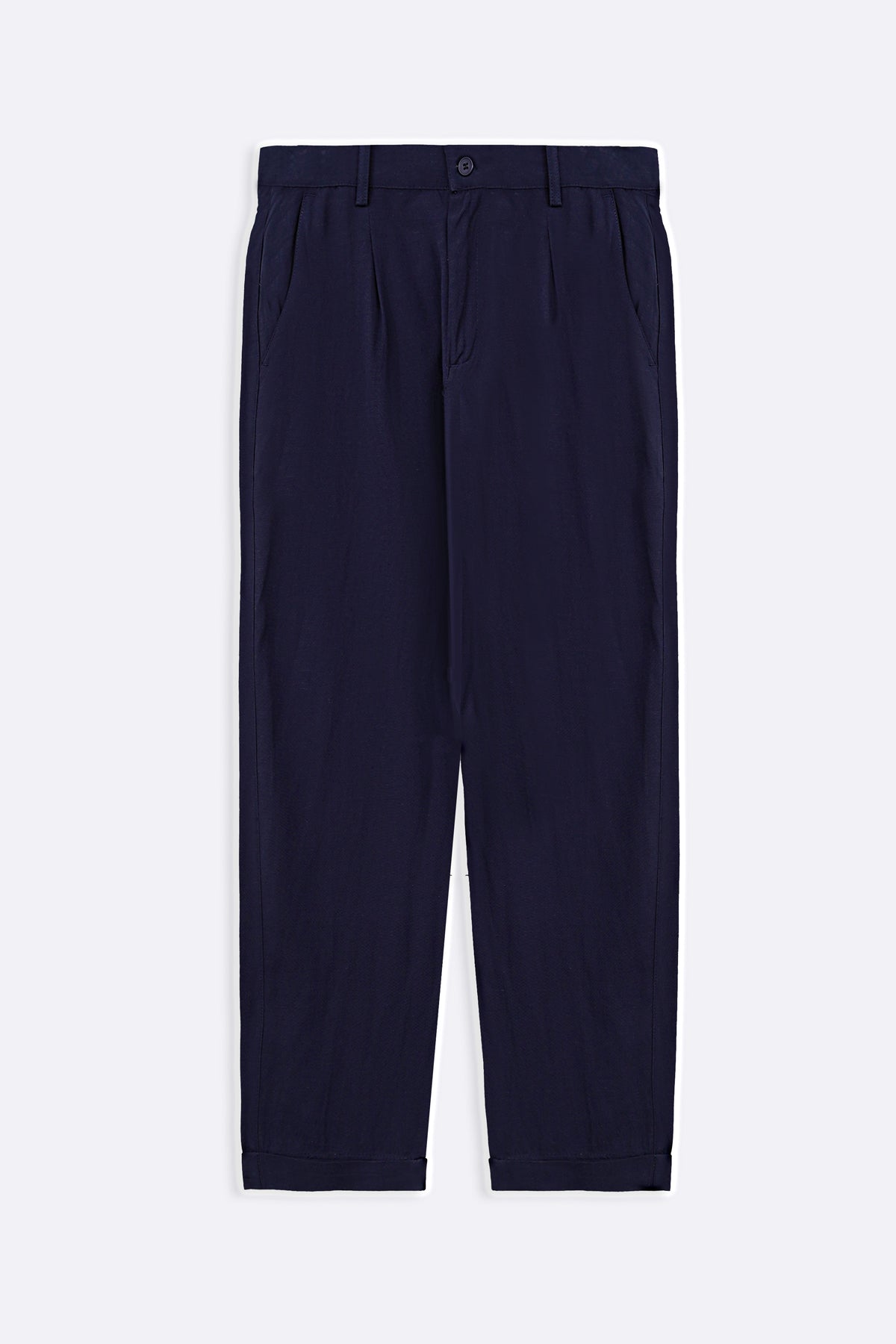 Design details: Turn-up pants with an elasticated waist band. Front cross pockets and two back bone pockets at the back.