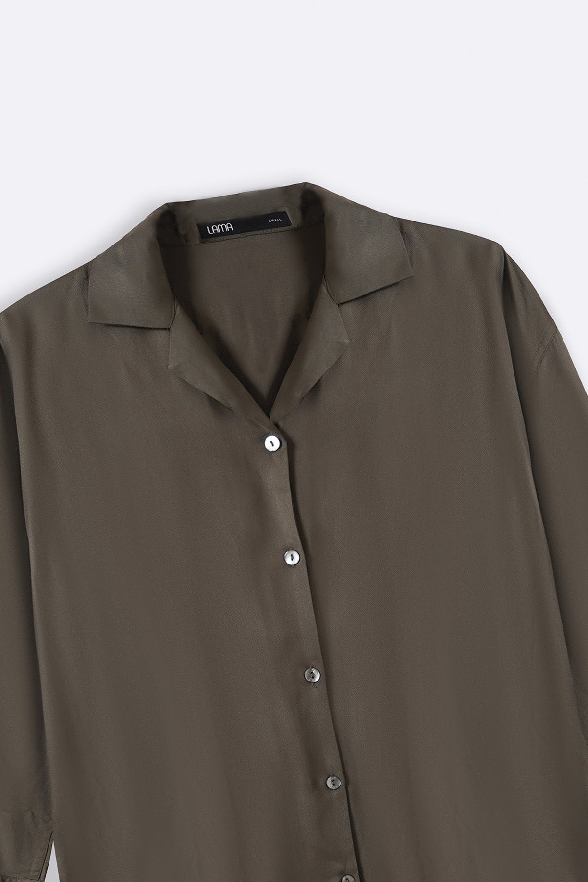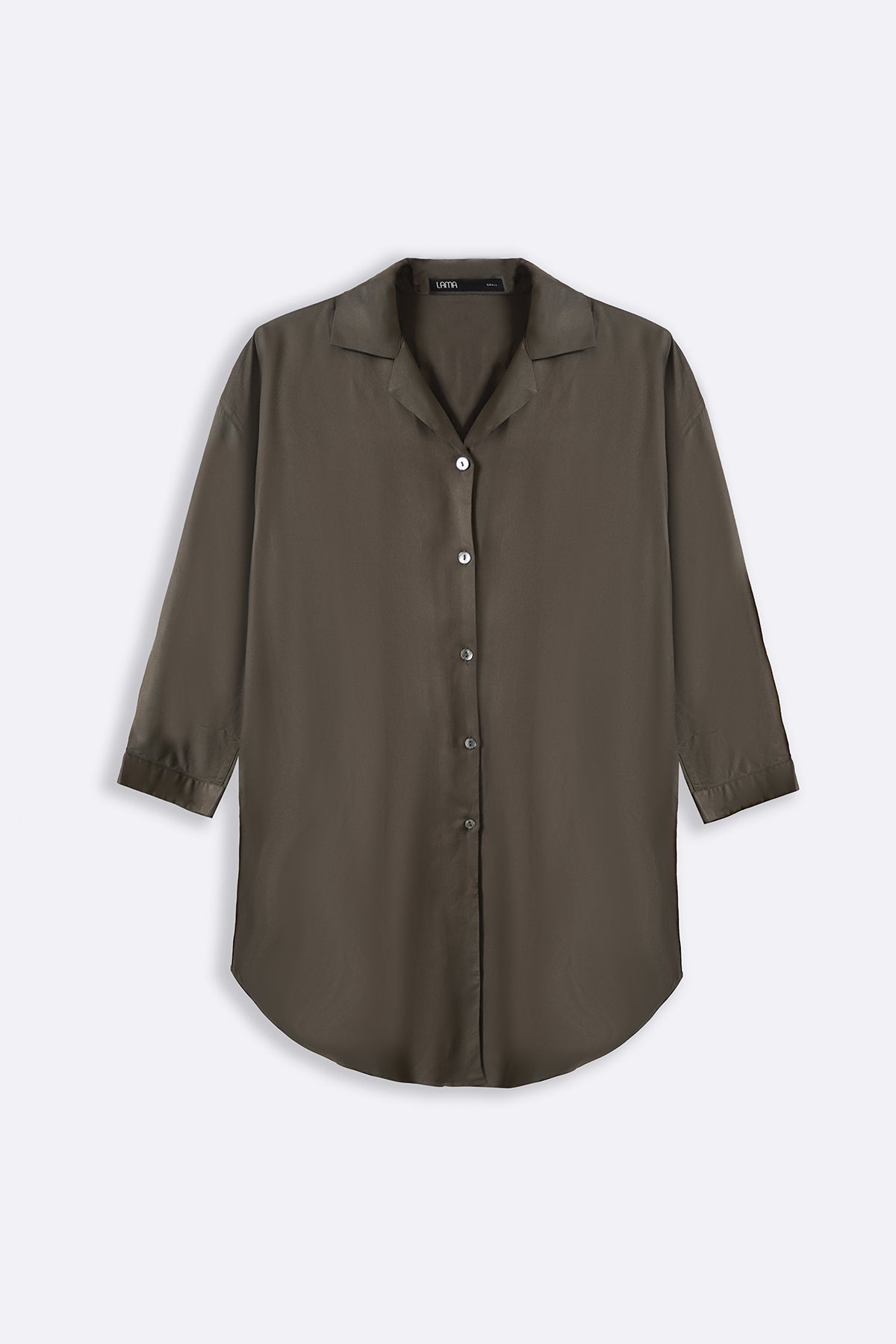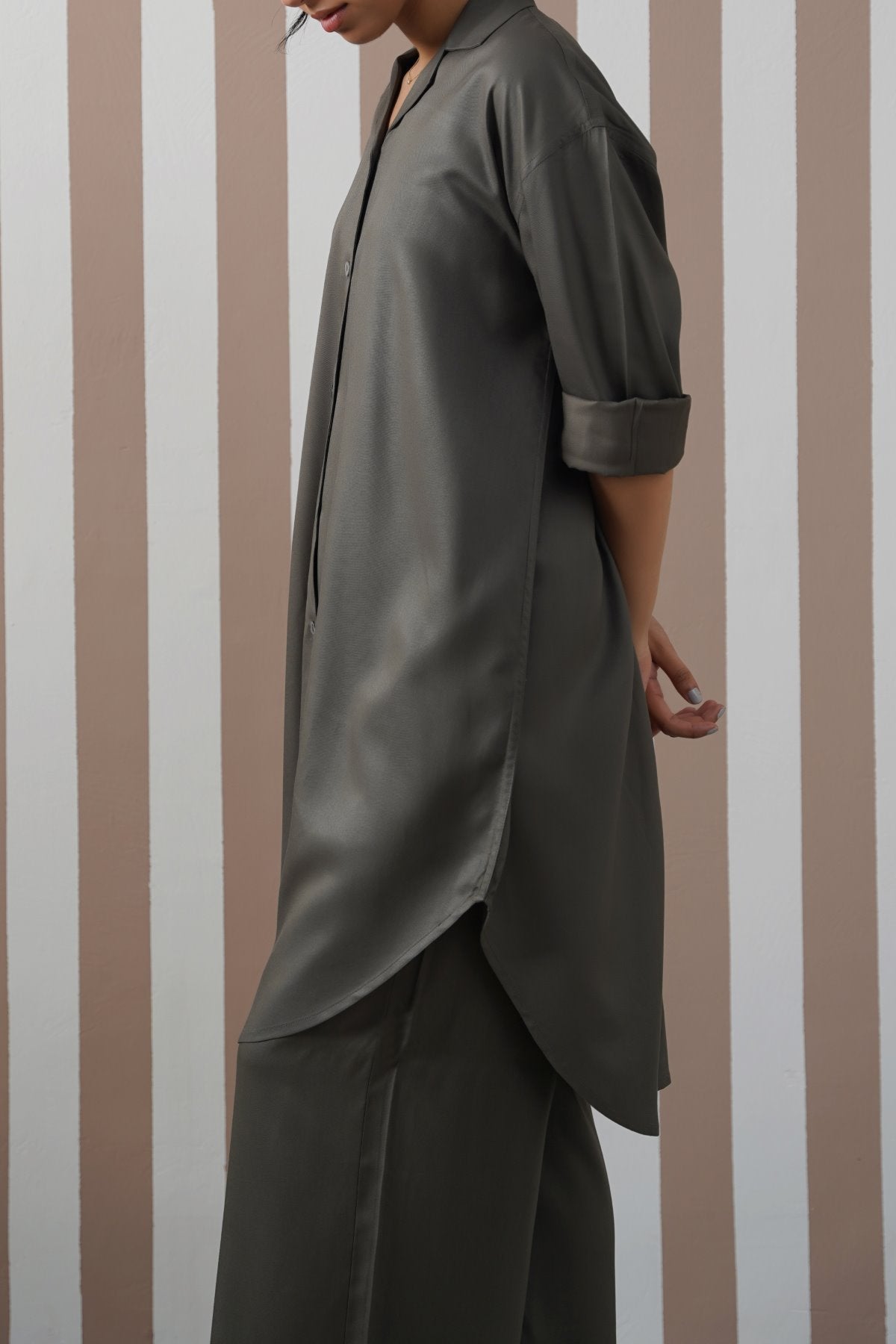 Design details: Tunic with a safari collar, back pleat detail, rounded hem, and full sleeves with buttoned cuffs.