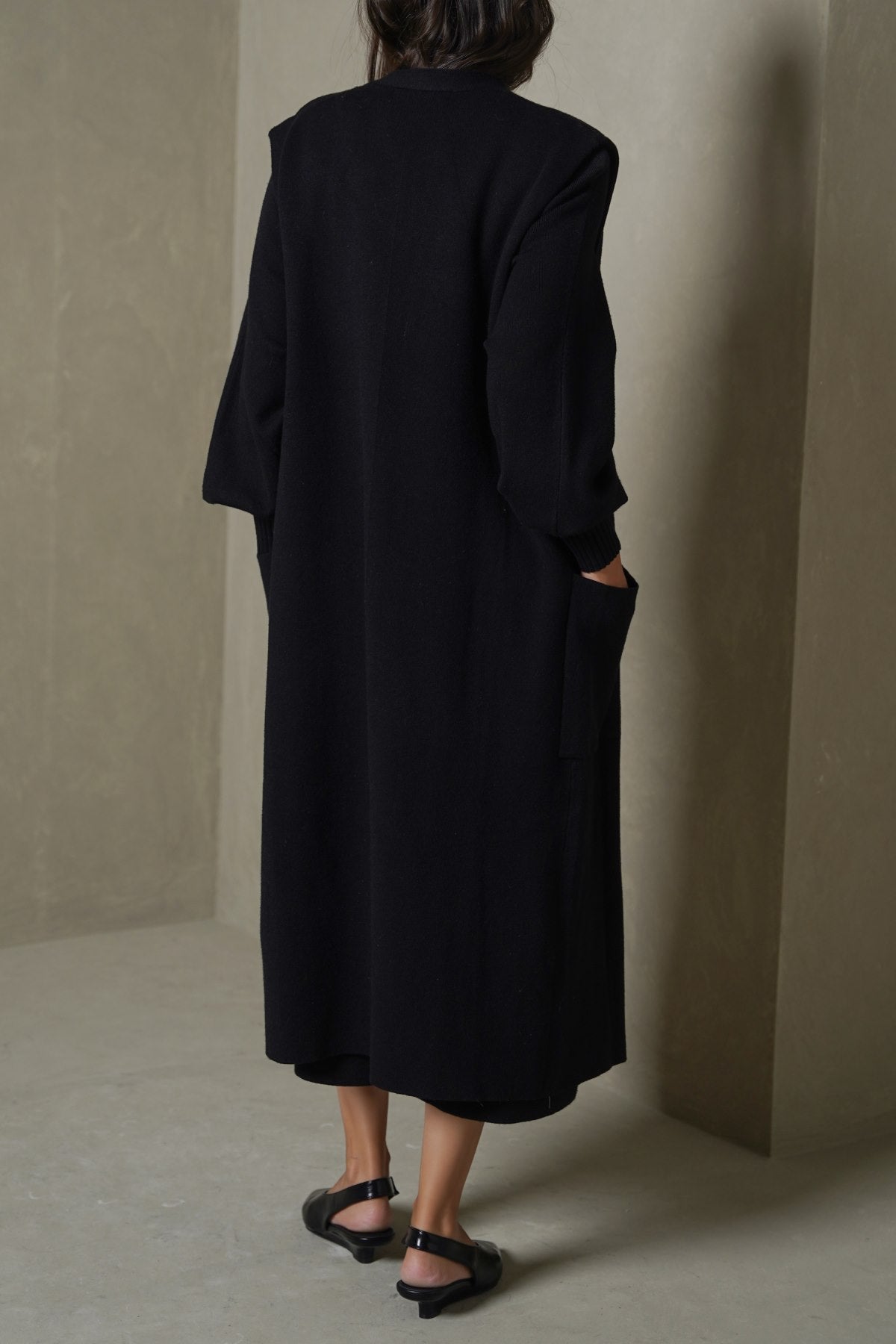 Design details: Sleeveless duster cardigan with front opening and pockets.