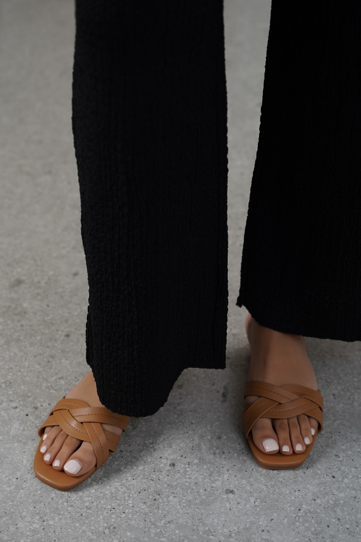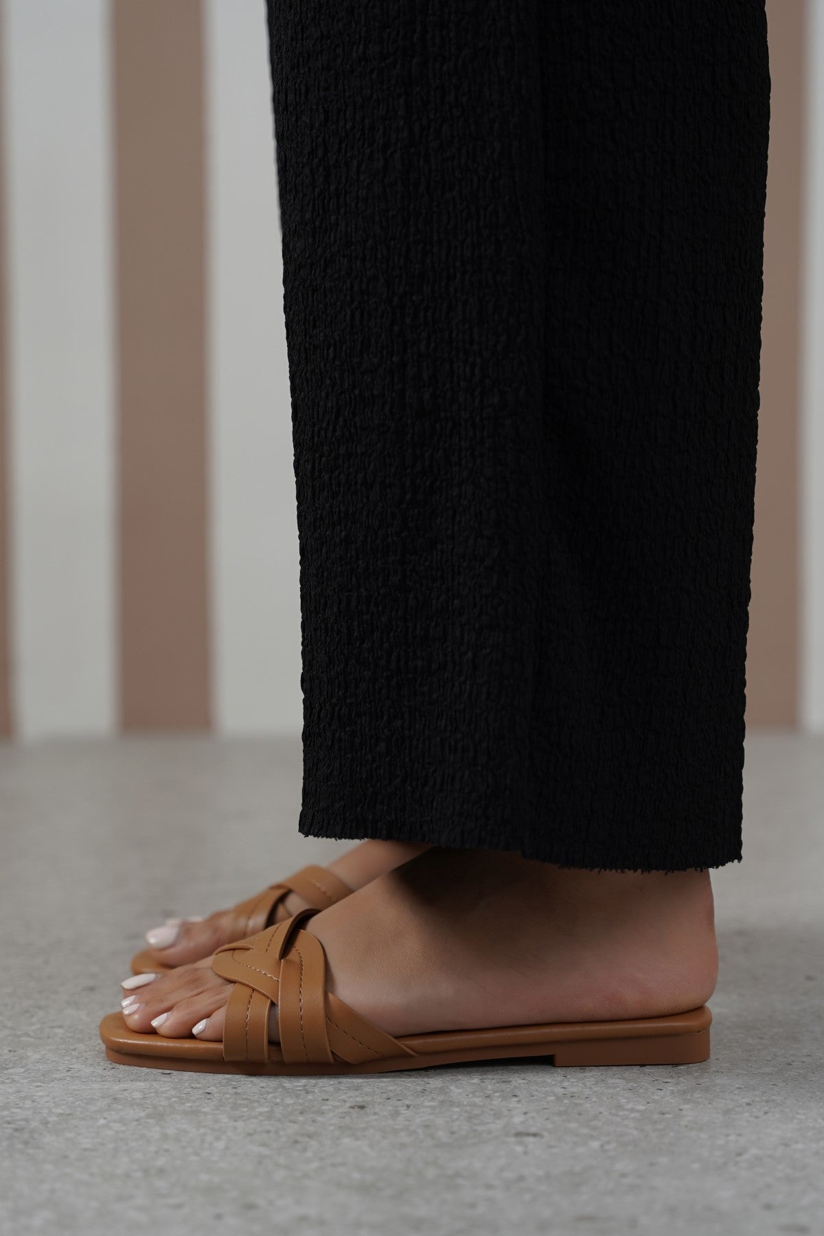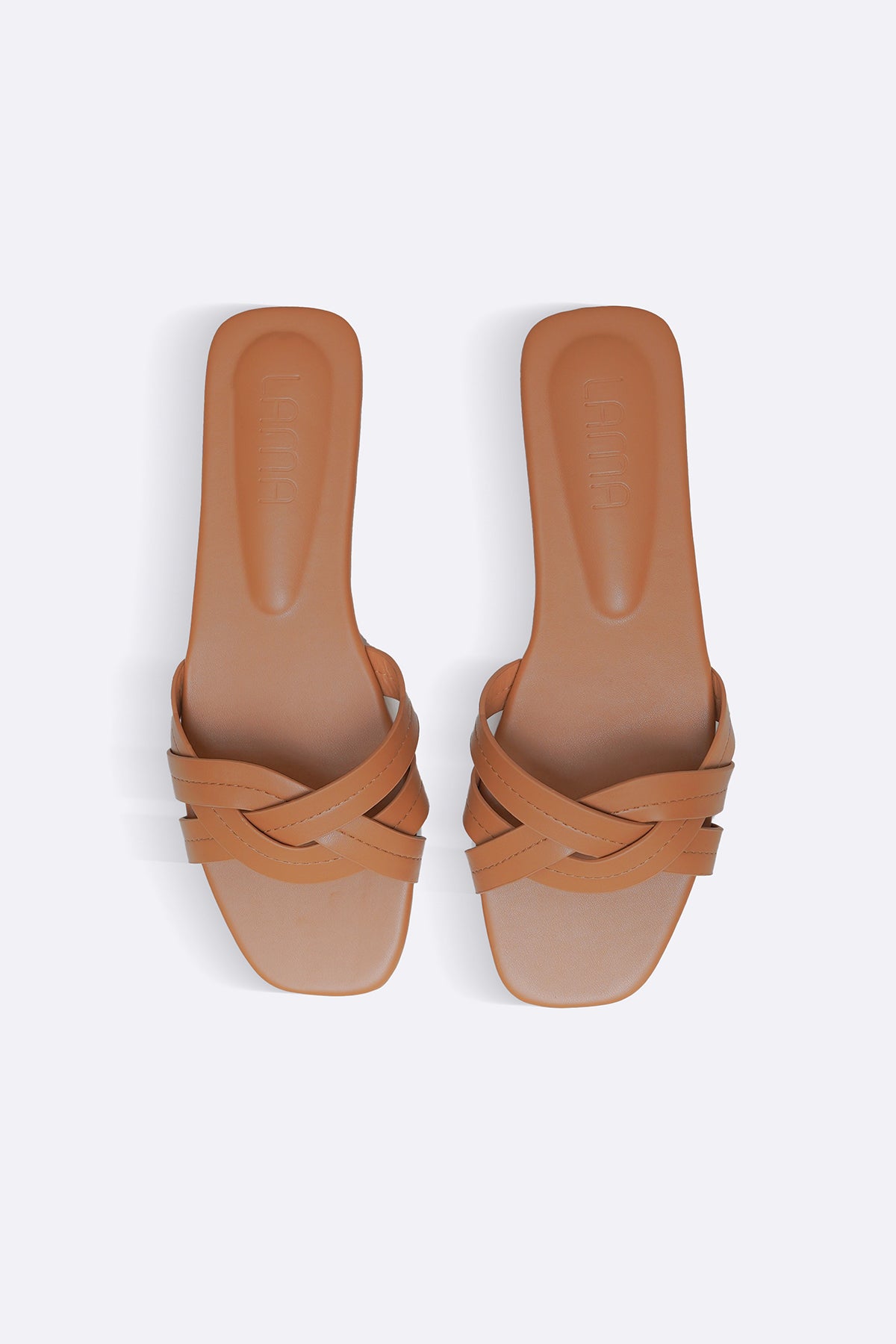 Everyday cushioned slides with criss-cross pattern and fine stitch detail.